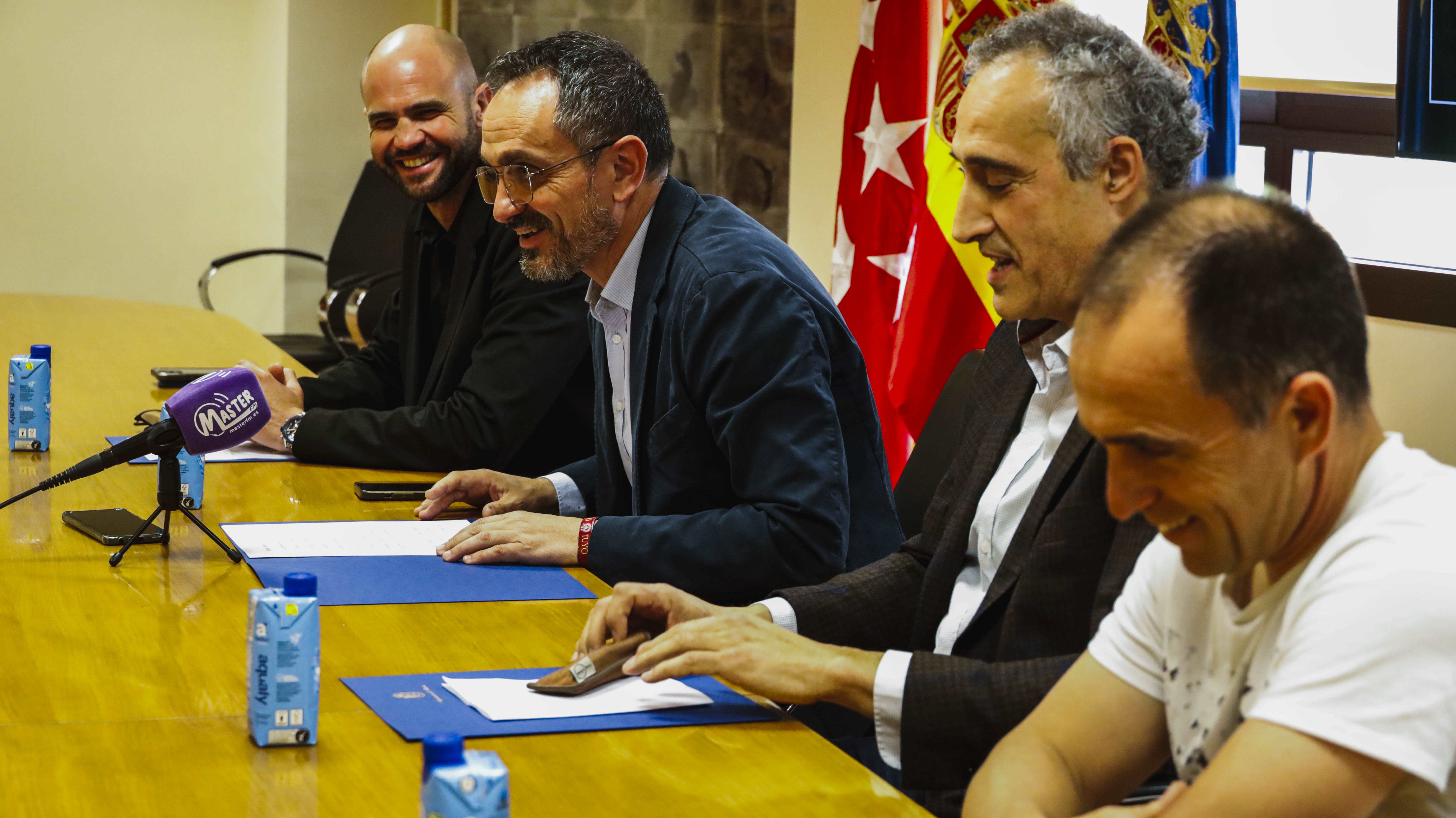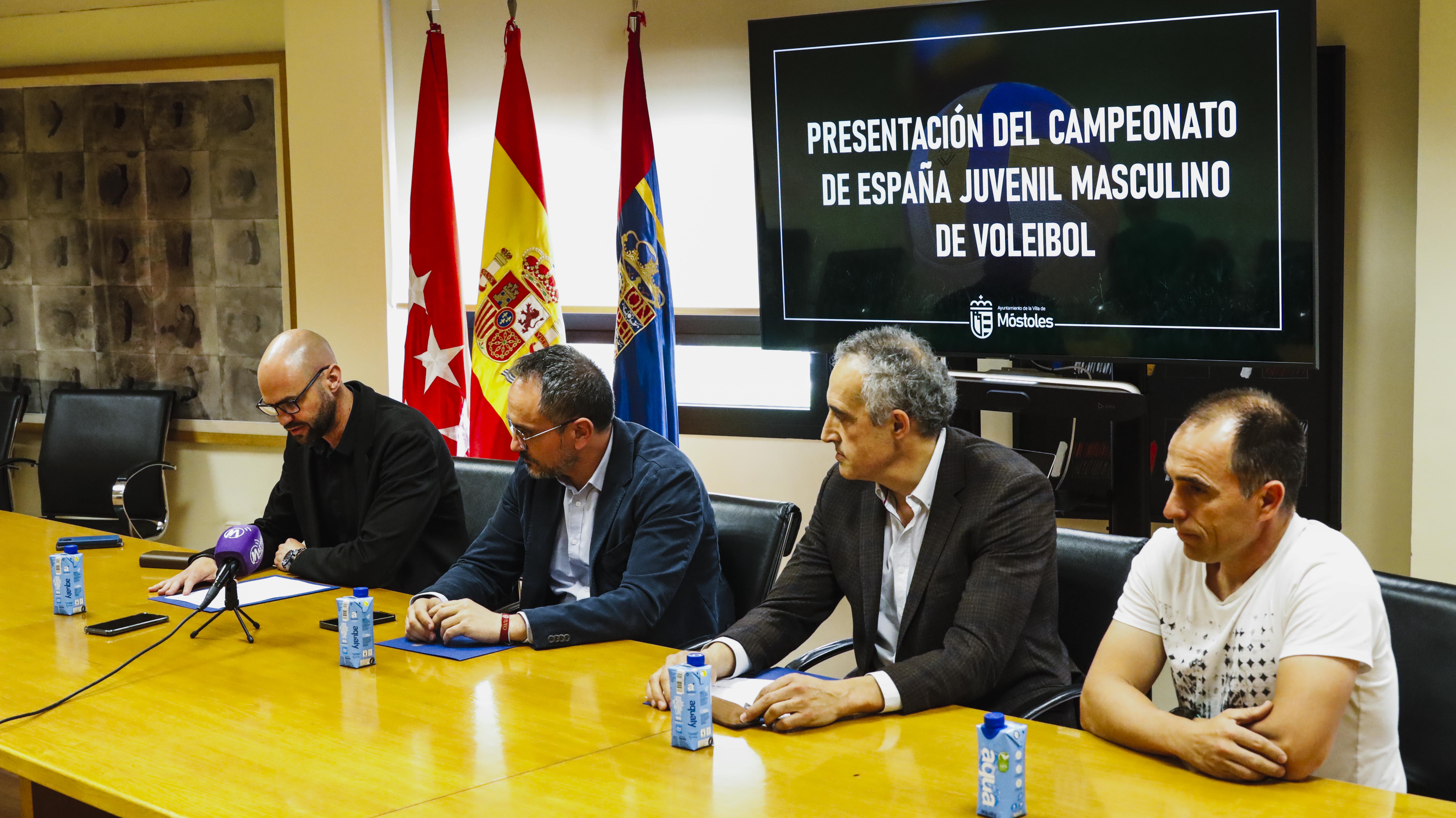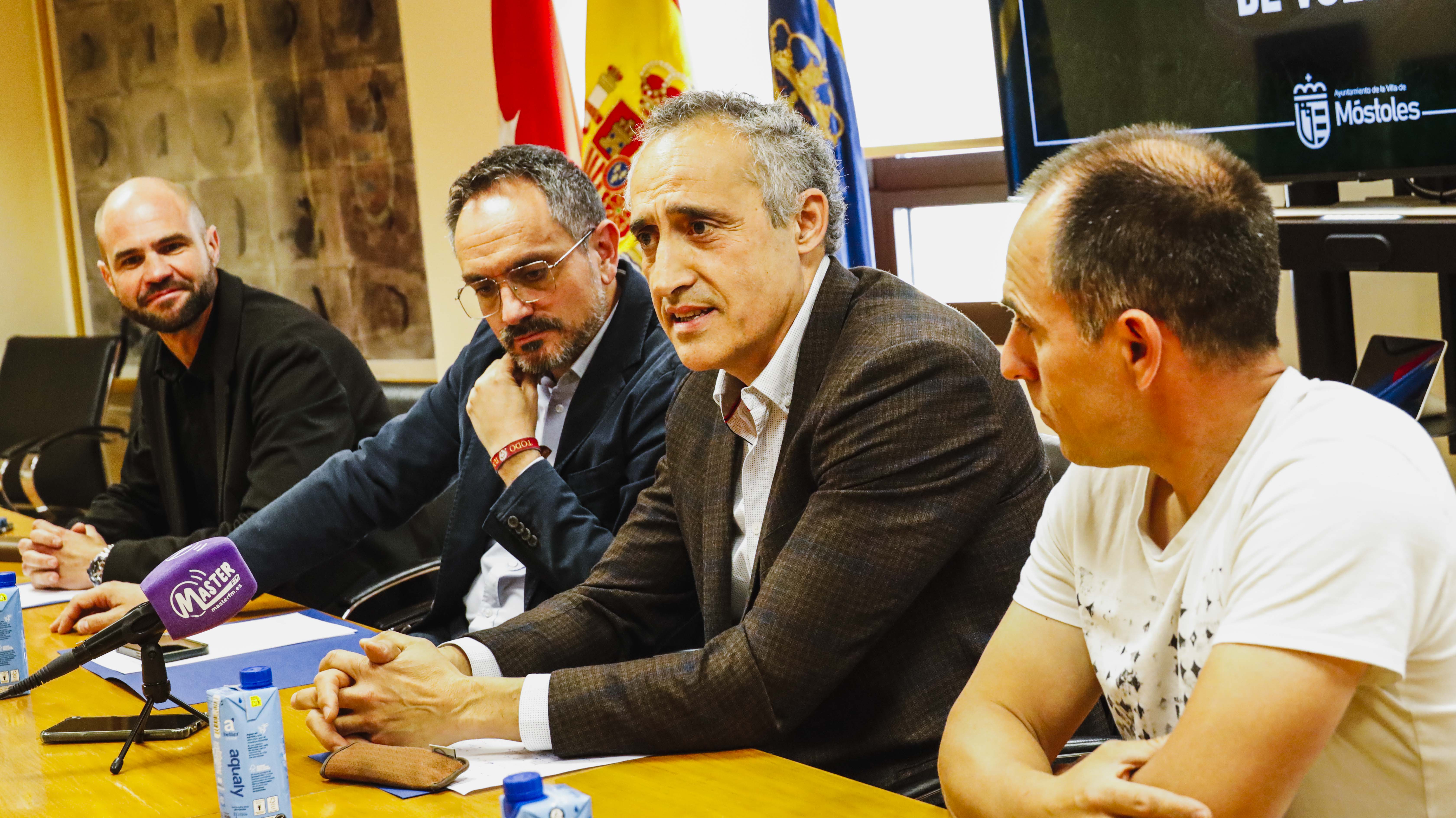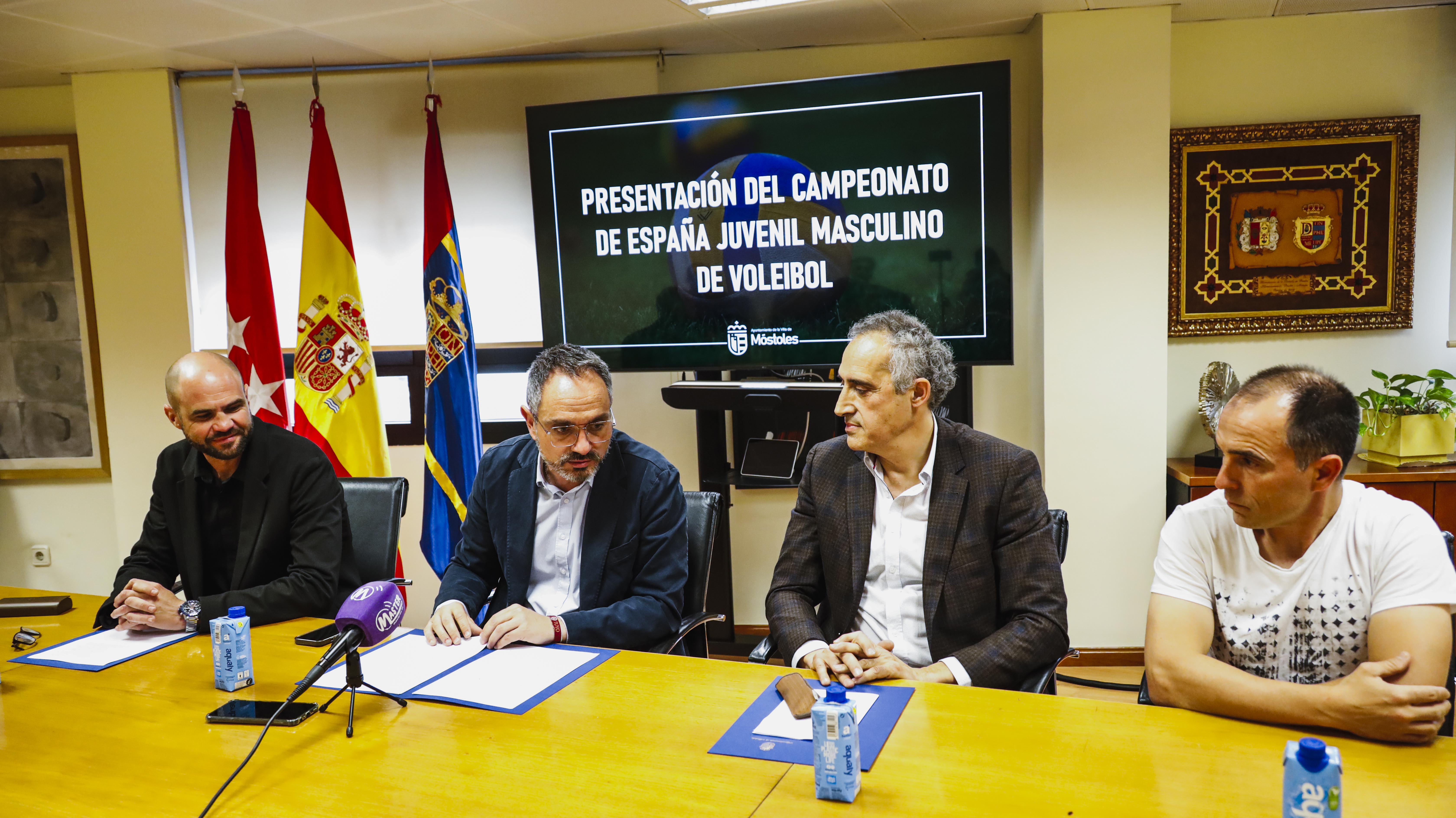 El Alcalde, Manuel Bautista, acompañado del vicepresidente de la Federación de Madrid de Voleibol, Javier García; el miembro de la Junta Directiva del Club Voleibol Móstoles, Alberto Lorenzo, y el Concejal de Deporte, Ángel Álvarez, ha sido el encargado de presentar hoy el campeonato.