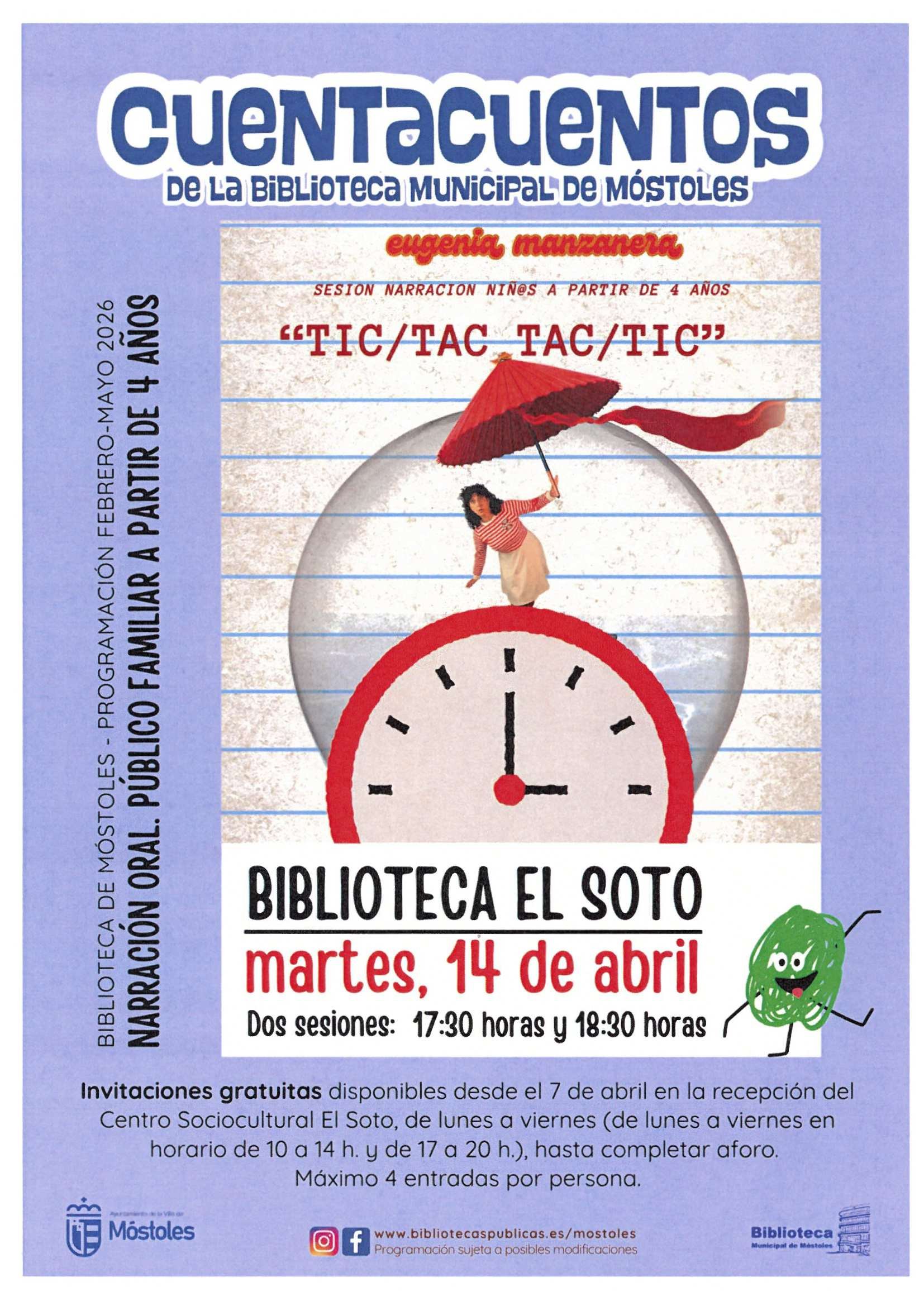 El Ayuntamiento de Móstoles organiza, a través de la Concejalía de Educación y Cultura, la agenda de la semana que comenzará el martes 14 de abril con una actividad para los más pequeños, como es el cuentacuentos "TIC/Tac TAC/Tic", a cargo de la narradora Eugenia Manzanera, en la Biblioteca del Centro Sociocultural El Soto, a las 17:30 h y a las 18:30 h, en dos sesiones de 30 minutos.