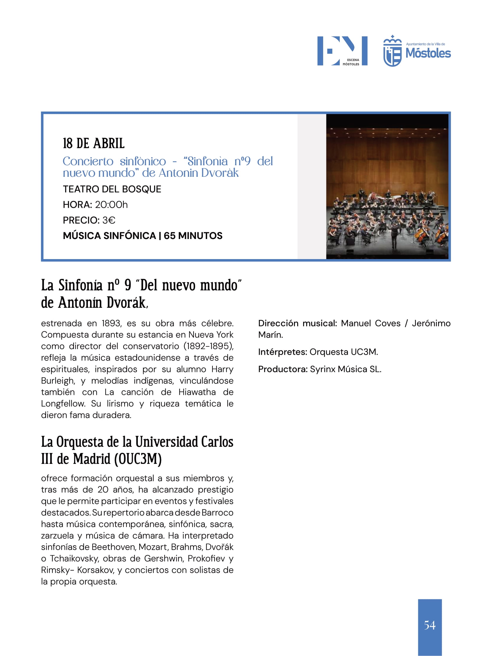 El sábado, en el Teatro del Bosque, a las 20:00 h, se ofrecerá un concierto de música sinfónica que permitirá al espectador deleitarse los sentidos con la Sinfonía nº 9 "Del nuevo mundo" de Antonín Dvořák", la obra más célebre de este compositor checo, estrenada en 1893, y que llega a Móstoles a cargo de la Orquesta de la Universidad Carlos III de Madrid (OUC3M), de reconocido prestigio tras más de 20 años ofreciendo conciertos con un repertorio musical que comprende desde el Barroco hasta música contemporánea, sinfónica, sacra, zarzuela y música de cámara.