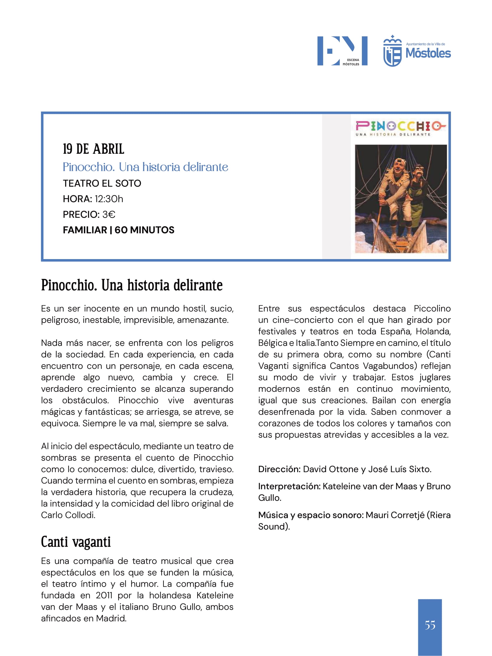 El domingo 19, llega un espectáculo de teatro de sombras, con "Pinocchio. Una historia delirante", a cargo de la compañía Canti Vaganti. Se podrá ver en el Teatro El Soto, a las 12:30 h, dirigido a todos los públicos. La historia de este personaje dulce e inocente en un mundo hostil que relata divertidas aventuras y cómo afronta los peligros superando obstáculos.