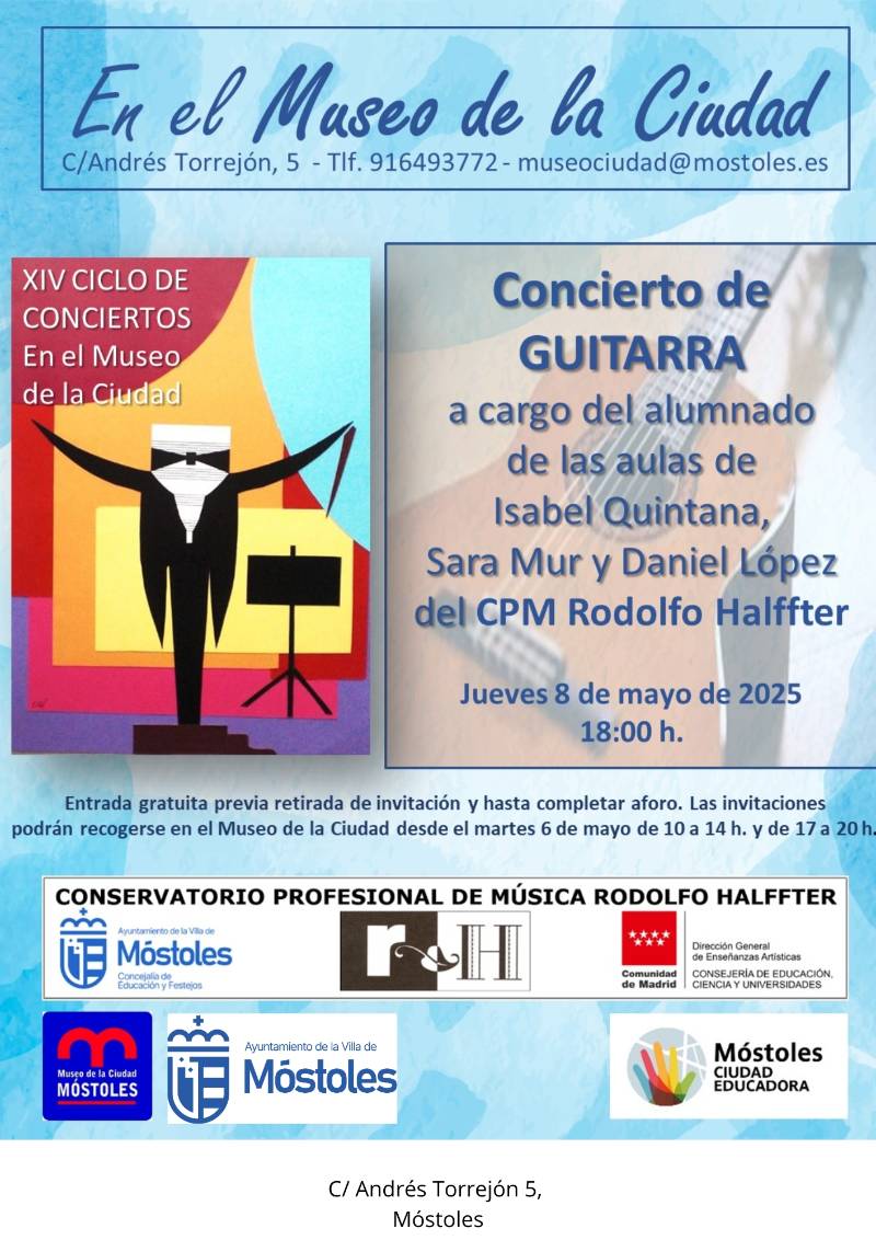 "Concierto de guitarra", a cargo del alumnado de las aulas de los profesores Isabel Quintana, Sara Mur y Daniel López, del Conservatorio Profesional de Música Rodolfo Halffter, dentro del XIV Ciclo de Conciertos en el Museo de la Ciudad a las 18:00 horas. Entrada gratuita previa retirada de invitaciones en el propio centro a partir del martes 6 de mayo.