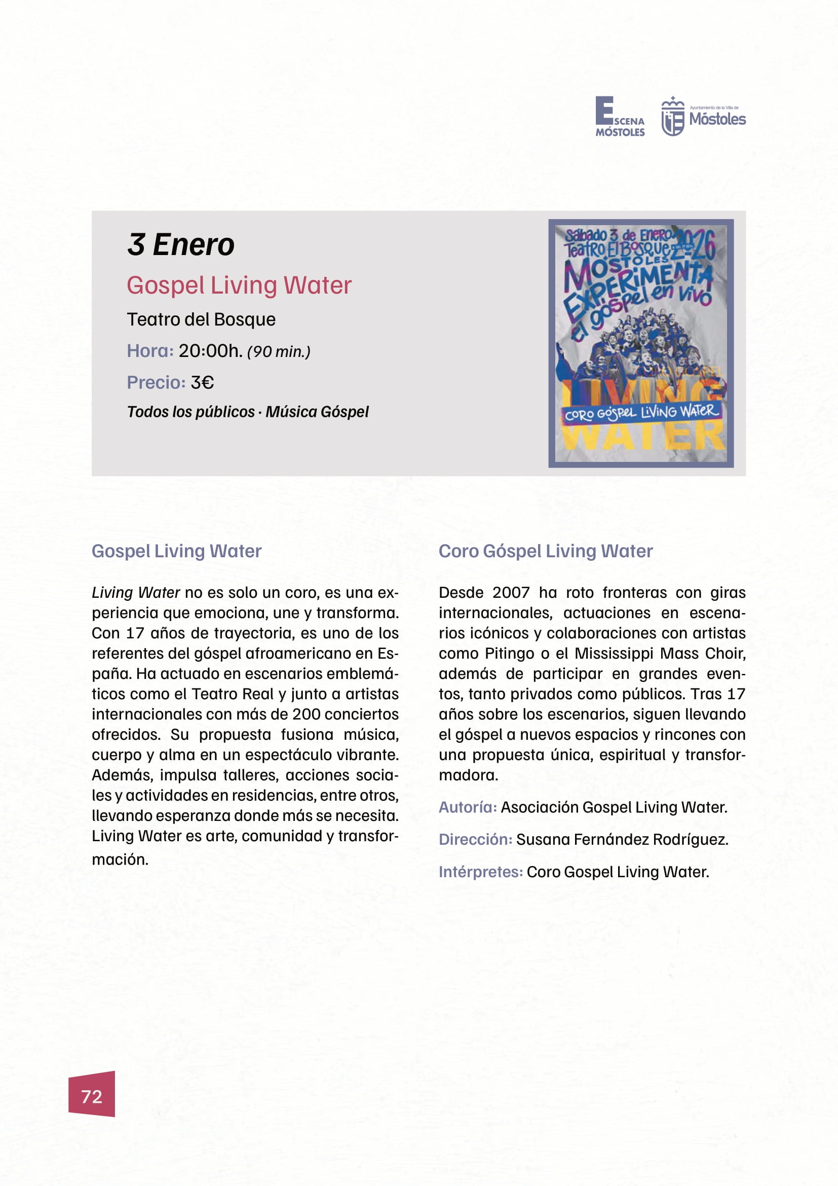Previamente, el sábado 3 de enero, Escena Navidad, ofrece el espectáculo musical Gospel Living Water, en el Teatro del Bosque, una experiencia que emociona, une y transforma gracias a su propuesta que fusiona música, cuerpo y alma. Living Water, es uno de los referentes del góspel afroamericano en España. Con 17 años de trayectoria, ha ofrecido más de 200 conciertos y se ha subido a las tablas de escenarios emblemáticos como el del Teatro Real y junto a artistas internacionales como Pitingo o el Mississippi Mass Choir.
