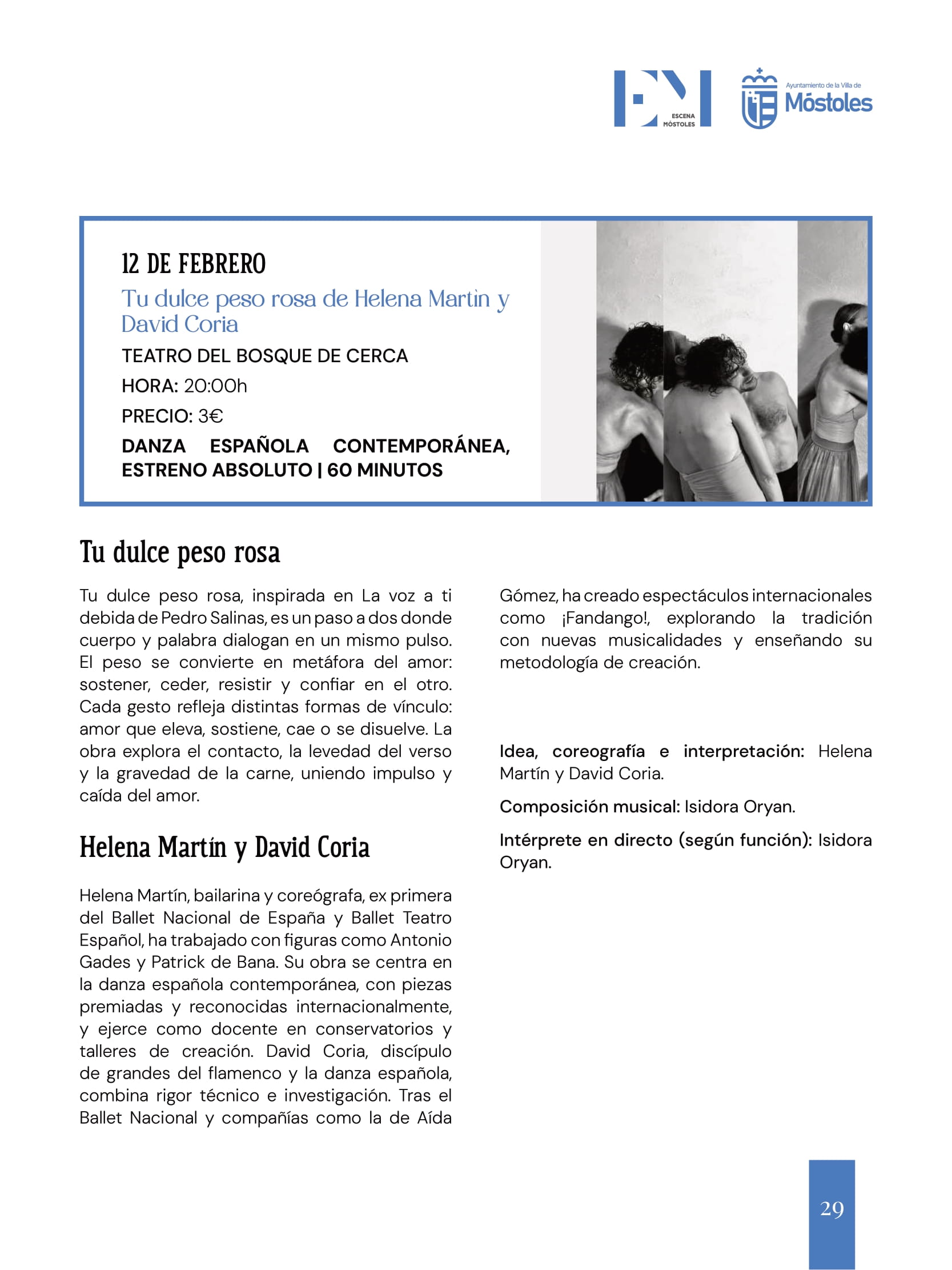 La danza de Helena Martín y David Coria llega el jueves 12, a las 20:00 h, al Teatro del Bosque con "Tu dulce peso rosa". Inspirada en "La voz a ti debida" de Pedro Salinas, es un paso a dos donde cuerpo y palabra dialogan en un mismo pulso. El peso se convierte en metáfora del amor: sostener, ceder, resistir y confiar en el otro. Cada gesto refleja distintas formas de vínculo: amor que eleva, sostiene, cae o se disuelve. La obra explora el contacto, la levedad del verso y la gravedad de la carne, uniendo impulso y caída del amor.
