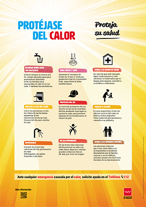 Si notamos alguna indisposición por el calor, es conveniente pedir ayuda a las personas más próximas, convivientes o vecinos/as. Si aparece gran sudoración junto con sensación de debilidad o mareo, calambres musculares, dolor de cabeza, etc., hay que dejar toda actividad, beber líquidos y refrescar el cuerpo. Si los síntomas se agravan, consultar al Centro de Salud o llamar al 112. La Consejería de Sanidad dispone de un Plan de Vigilancia y Control de los Efectos en Salud de las Olas de Calor diseñado para minimizar sus consecuencias. Es un plan preventivo en el que se informa con antelación suficiente, tanto a la población general como a profesionales sanitarios y de servicios sociales, para que en caso de ola de calor, la población pueda adoptar las medidas de protección adecuadas. Este año el Plan se encuentra activado desde el 15 de mayo hasta el 15 de septiembre, pudiéndose acceder a él en: http://www.comunidad.madrid/servicios/salud/calor-salud A través de esta página las personas también pueden subscribirse de forma gratuita para recibir información diaria del nivel de alerta por calor que tendremos en los próximos días. También es posible suscribirse a través del teléfono móvil enviando un SMS con el texto ALTACALOR al número 217035 de la Comunidad de Madrid solicitando ser dado de alta en el Sistema. La suscripción que se realiza por esta vía solo permite recibir notificaciones vía SMS -no vía e-mail- cuando se activa o desactiva una alerta. Recuerde siempre que ante cualquier emergenciacausada por el calor, puede solicitar ayuda en el Teléfono 112. |