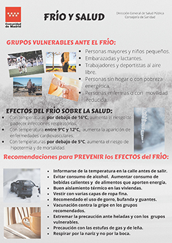 Puede solicitar más información y ayuda consultando a su profesional médico o de enfermería en su centro de salud. También en la web de la Consejeria de Sanidad de la Comunidad de Madrid, en el Plan de Vigilancia y Control de los Efectos del Frío en Salud: |