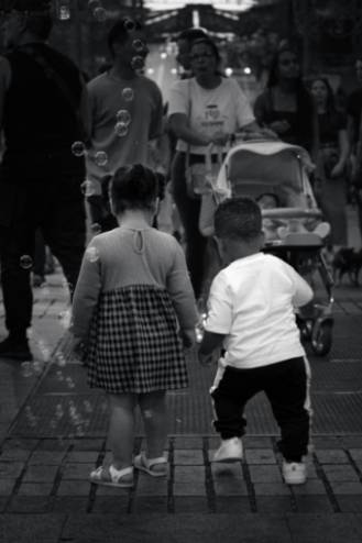 El segundo premio ha sido para "La felicidad está en la sencillez", de Miriam Jiménez Cabral, una imagen que emociona por su ternura y sinceridad. La autora ha logrado capturar un momento efímero y encantador como son dos niños caminando entre burbujas, ajenos al bullicio de la fiesta que los rodea. La imagen transmite una sensación de alegría pura y nostálgica, recordándonos que en la mirada infantil reside la esencia de la celebración. La composición y el enfoque juegan con lo espontáneo, lo fugaz, lo que apenas se sostiene en el tiempo, como las propias burbujas que envuelven a los protagonistas.