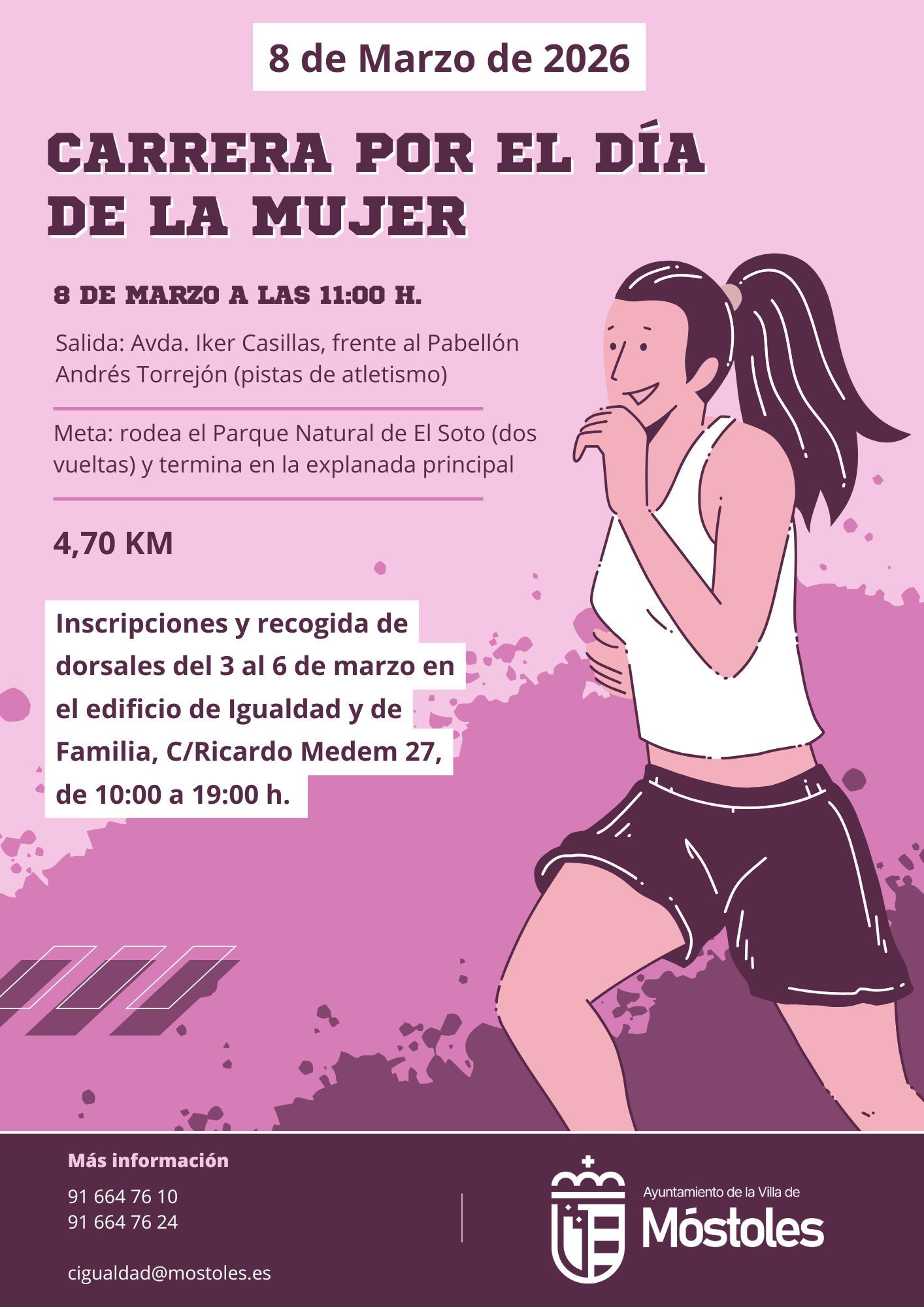 El domingo 8 de marzo se celebrará la Carrera por el Día de la Mujer, que dará comienzo a las 11:00 h, desde la Avenida Iker Casillas, frente al Pabellón Andrés Torrejón. Los participantes podrán recorrer una distancia de 5 kilómetros por el Parque Natural de El Soto. Las inscripciones y recogida de dorsales se podrán realizar del 3 al 6 de marzo en el edificio de Igualdad y Familia, calle Ricardo Medem, 27, de 10:00 h a 19:00 h.