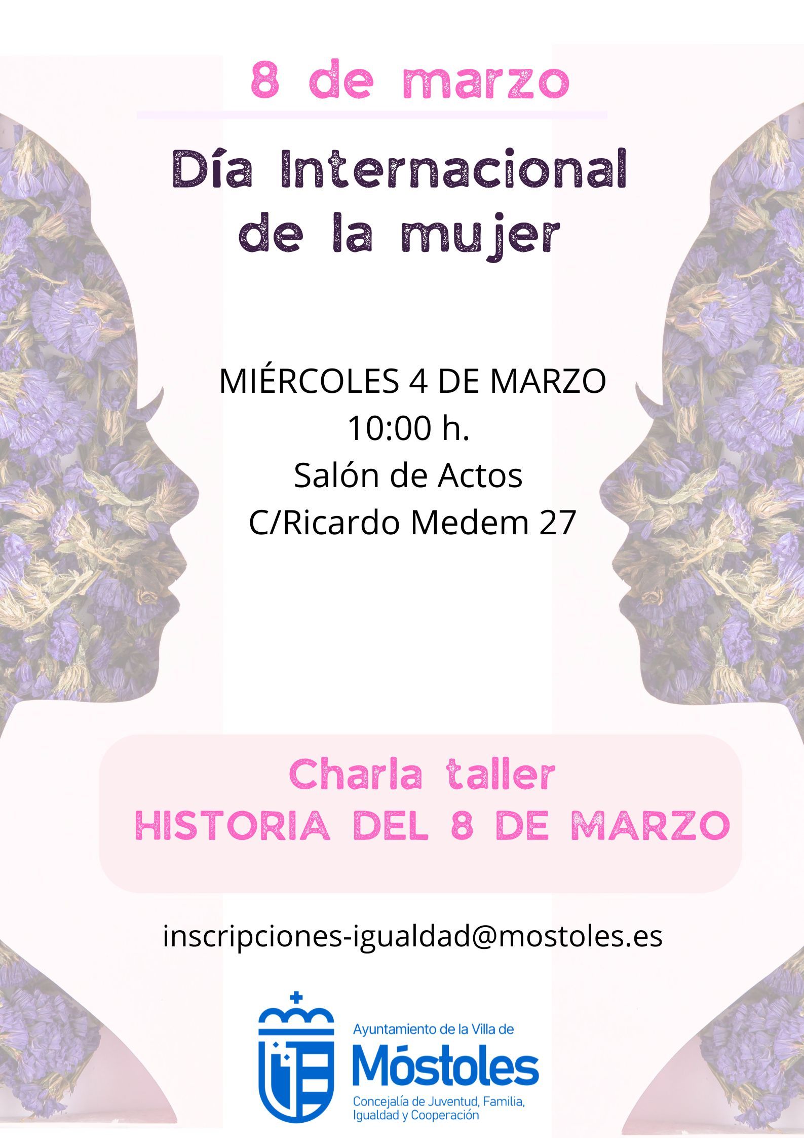 El miércoles, 4 de marzo, la programación continúa con una charla-taller sobre el "8 de marzo en la Historia", de 10:00 h a 11:30 h, que tendrá lugar en el Salón de Actos de la calle Ricardo Medem, 27, a cargo de las agentes de Igualdad.