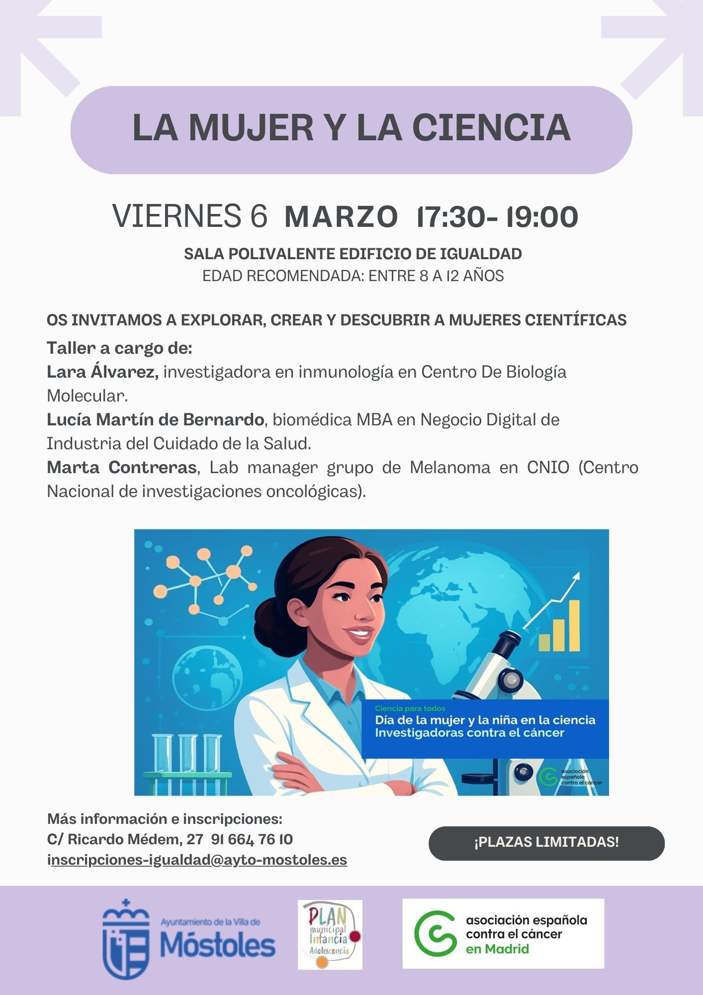 El viernes 6 de marzo, la Plaza de España acogerá el acto de inauguración de la exposición "Pioneras. La mujer del siglo XX", a las 11:30 h. Por la tarde, de 17:30 h a 19:00 h, se llevará a cabo el taller infantil "Celebrando a mujeres en la ciencia", en la Sala de Usos Polivalente, calle Ricardo Medem, 27. Esta actividad está organizada en colaboración con la Asociación Española contra el Cáncer, dirigida de a menores de entre 8 y 12 años. Para participar es necesario realizar una inscripción previa enviando un email a inscripciones-igualdad@mostoles.es