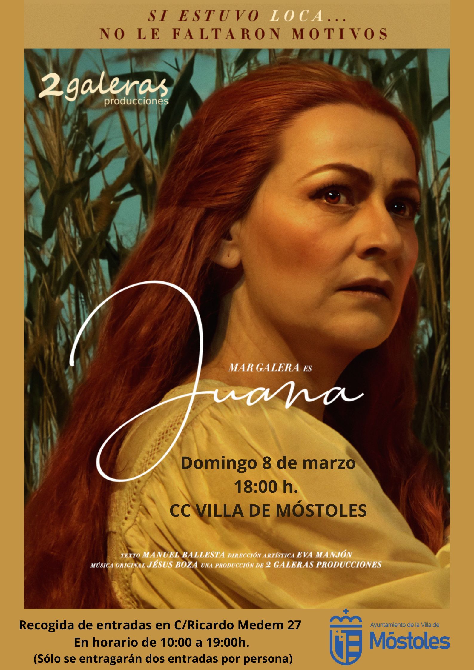 Por la tarde, a las 18:00 h, se representará la obra "Juana", en el Centro Cultural Villa de Móstoles. Las entradas pueden recogerse en la calle Ricardo Medem, 27, desde el 27 de febrero, de 10:00 h a 19:00 h.