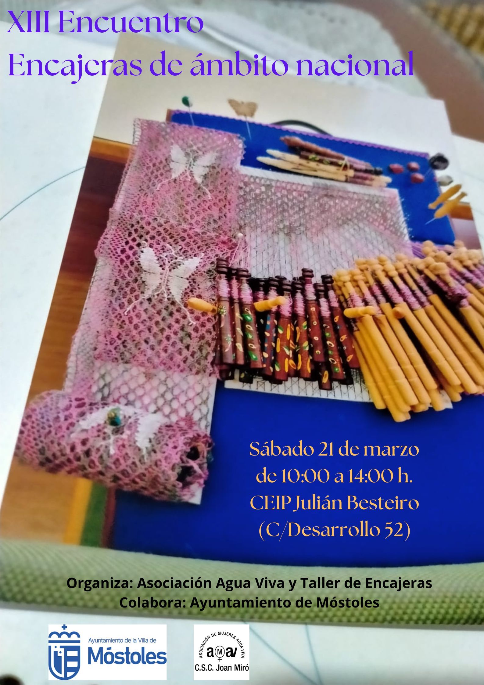 El sábado 21 de marzo se celebrará la XIII edición del Encuentro de Encaje de Bolillos, un evento organizado por la Asociación Agua Viva que ya es tradición en el municipio y que se lleva a cabo en el Centro de Educación de Infantil y Primaria (CEIP) Julián Besteiro, desde las 10:00 h hasta las 14:00 h. Esta cita congrega a mujeres de todo el ámbito nacional que vienes hasta Móstoles para compartir su pasión y mostrar todos los trabajos realizados con esta técnica de encaje textil, intercambiar experiencias e impresiones con otras participantes que elaboran estas auténticas obras de arte.