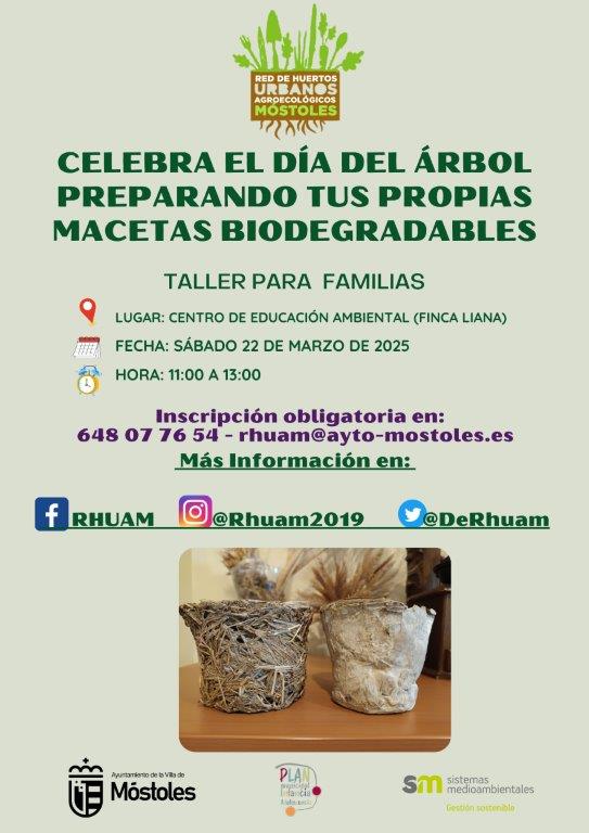 Además, con motivo del Día del Árbol el sábado 22, de 11:00 h a 13:00 h, tendrá lugar en el Centro de Educación Ambiental un taller gratuito dirigido a familias, donde los participantes podrán aprender a preparar sus propias macetas biodegradables.