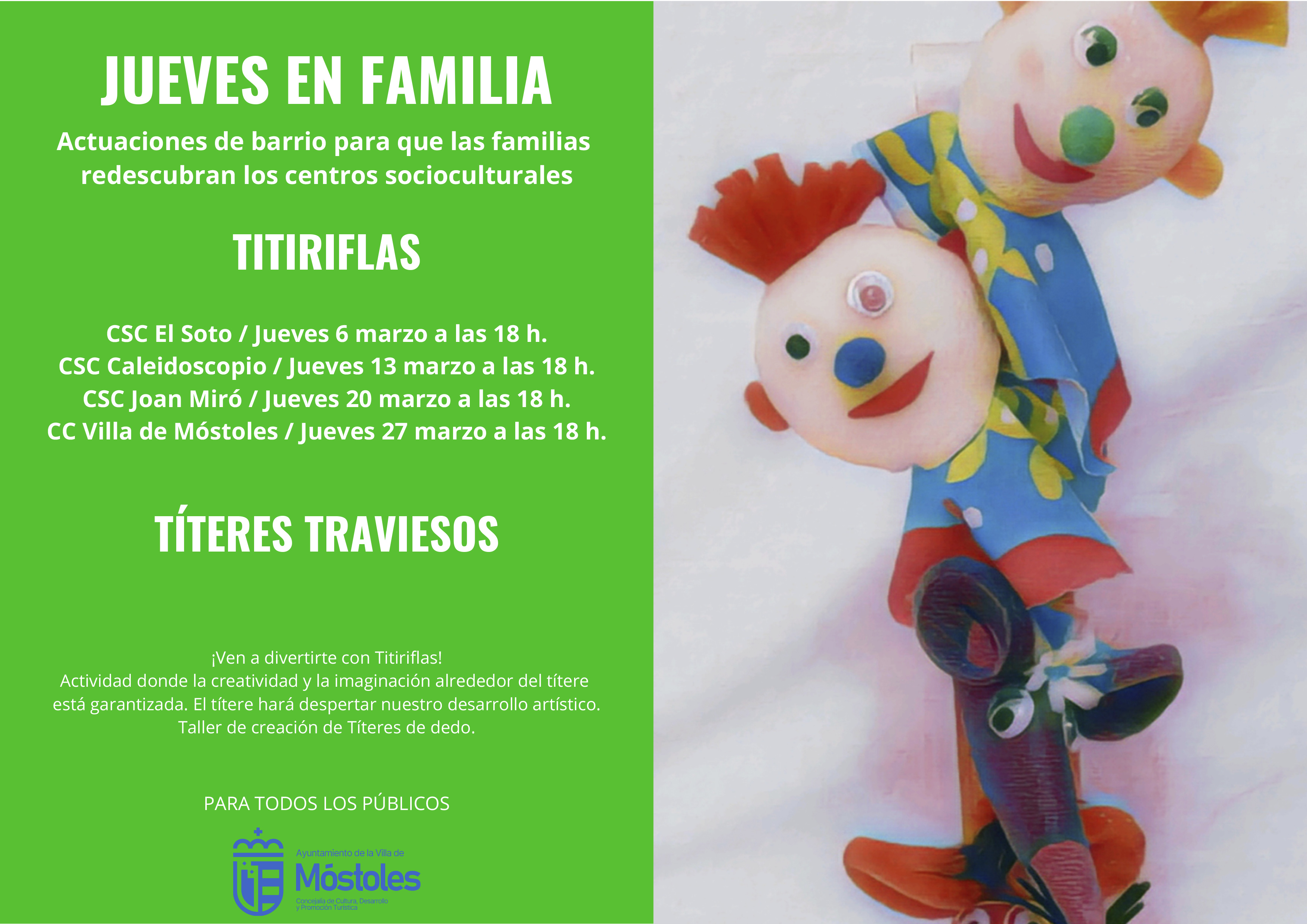 La compañía Titiriflas estará con "Títeres traviesos" el jueves 6 en el Centro Sociocultural El Soto, el jueves 13 en el Centro Sociocultural Caleidoscopio, el jueves 20 en el Centro Sociocultural Joan Miró y el jueves 27 en el Centro Cultural Villa de Móstoles. Todas las sesiones comenzarán a las 18:00 h. La entrada es libre hasta completar aforo.