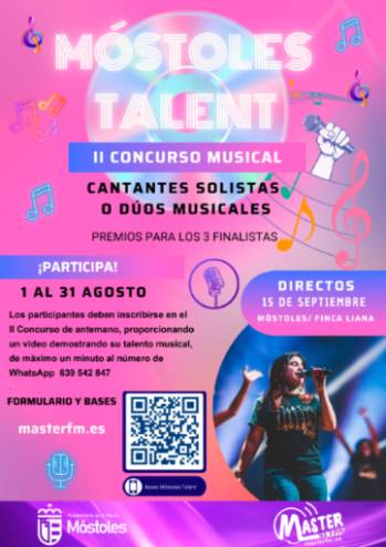 El Ayuntamiento de Móstoles, a través de la Concejalía de Juventud, Familia, Igualdad y Cooperación, invita a todos los mostoleños a participar en la II edición del Concurso musical "Móstoles Talent". Para participar, es necesario inscribirse enviando un video en el que se demuestre el talento musical, ya sea como cantante solista o como dúo musical.