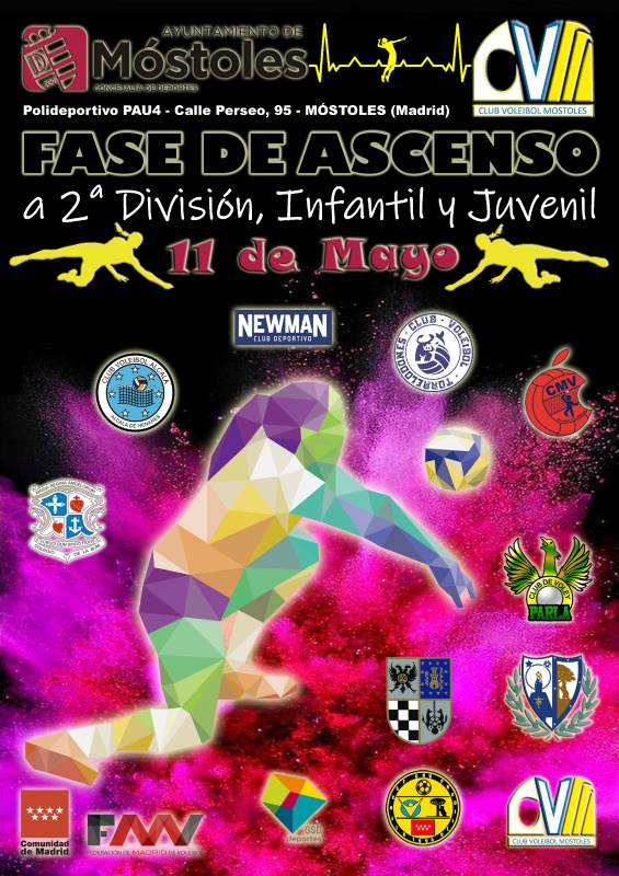 Imagen en alta resolución. Este enlace se abrirá mediante lightbox, puede haber un cambio de contextoCon motivo de la clasificación de los equipos infantil y juvenil femenino en la fase de Liga para el ascenso a segunda división, el Club Voleibol Móstoles organiza la fase de ascenso de estas dos categorías. Durante la jornada, que se celebrará el 11 de mayo en las instalaciones del Pabellón Municipal Móstoles Sur, 12 equipos se disputarán las plazas para el ascenso a la categoría superior.