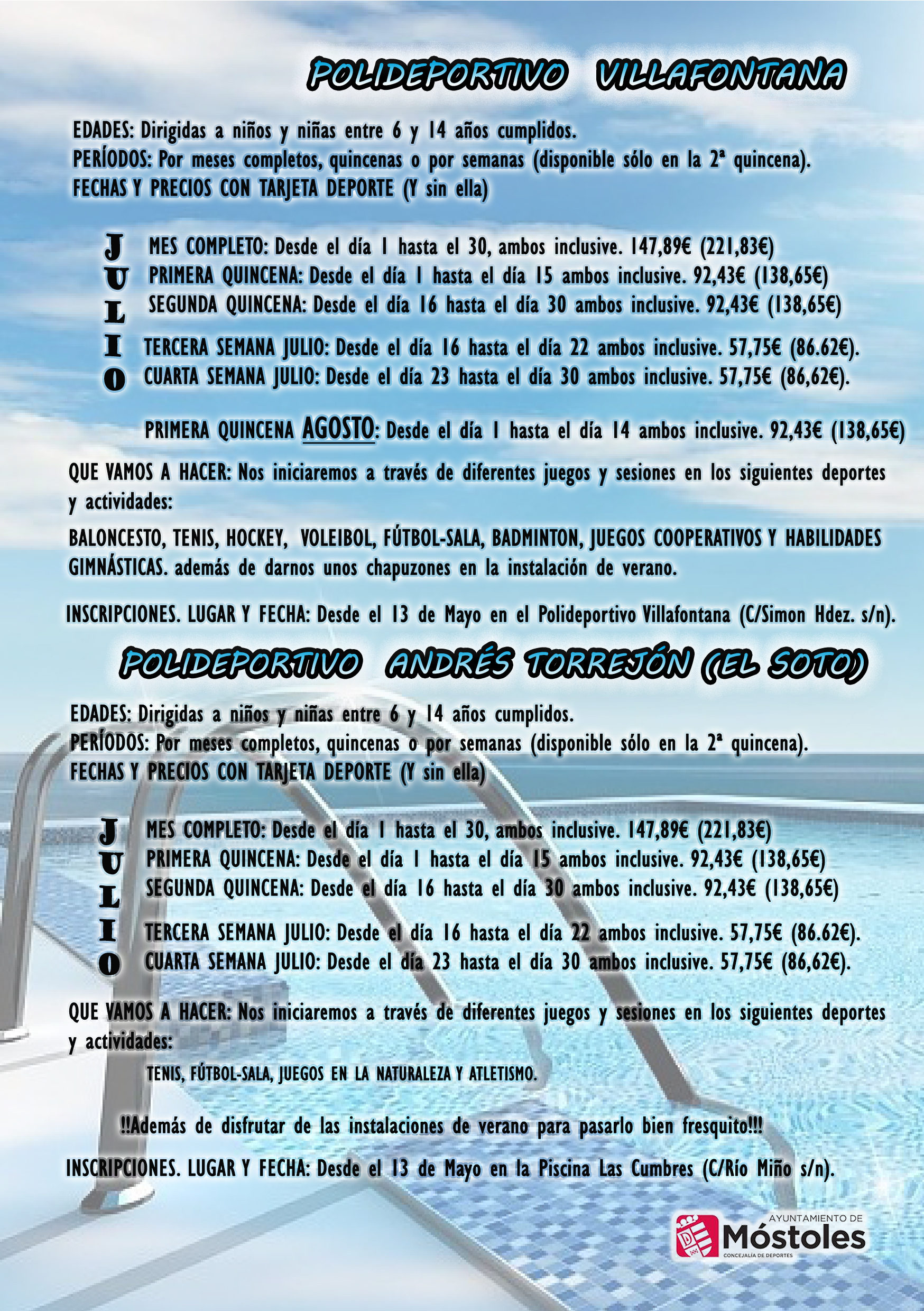 Durante dicho periodo, los participantes en el polideportivo Villafontana podrán realizar actividades multideportivas como baloncesto, tenis, hockey, voleibol, fútbol-sala, bádminton, juegos cooperativos y habilidades gimnásticas, además de baños en la piscina. Mientras que en el polideportivo Andrés Torrejón se practicarán diferentes juegos y sesiones en los deportes y actividades siguientes: tenis, fútbol-sala, juegos en la naturaleza y atletismo.