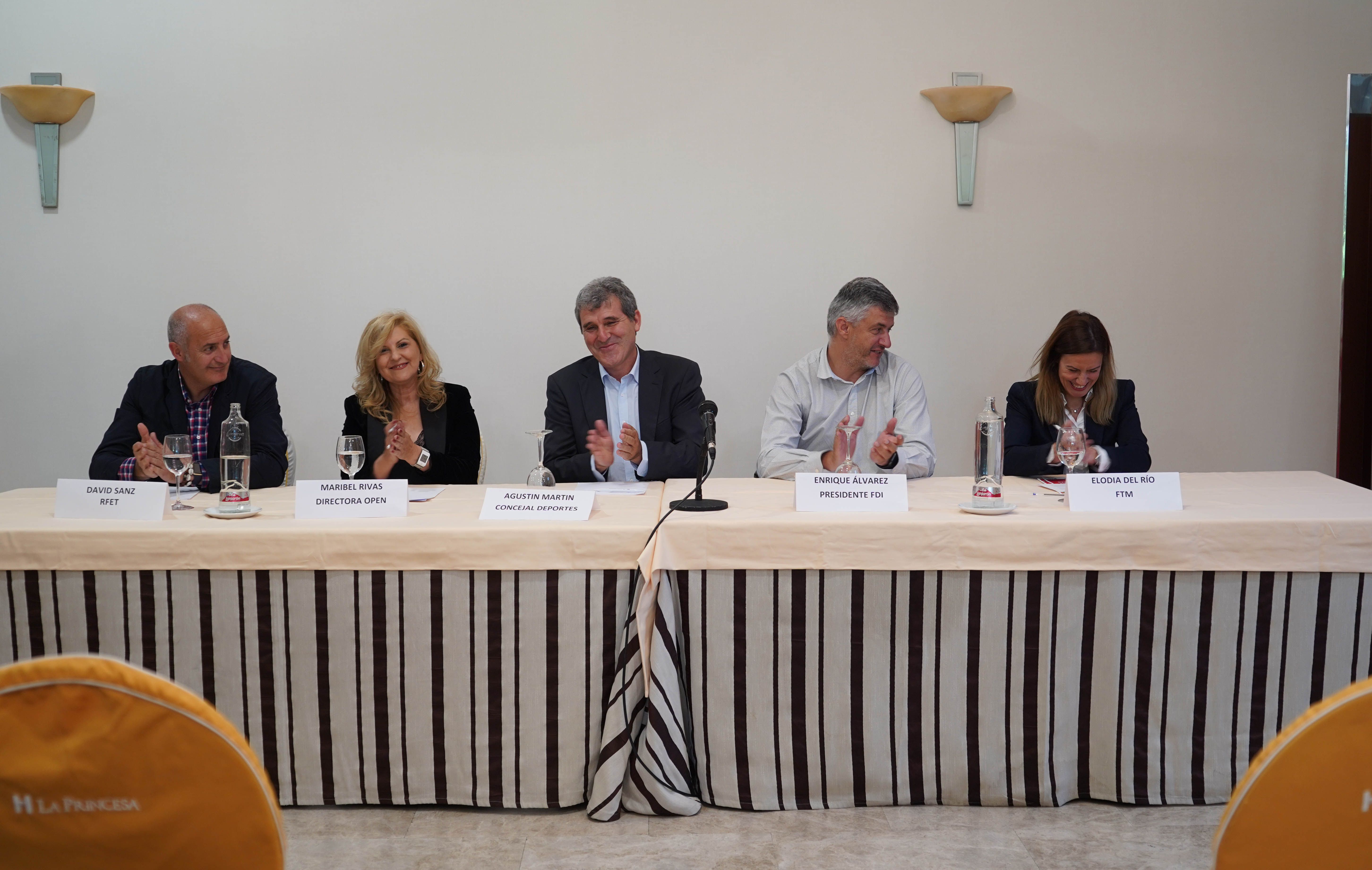 El concejal de Deportes, Agustín Martín, el director del Área de Docencia e Investigación de la Real Federación Española de Tenis, David Sanz, Elodia del Río, de la Federación de Tenis de Madrid, el presidente de la Fundación para el Desarrollo y la Integración (FDI), Enrique Álvarez Orcajo, y la directora del Open, Maribel Rivas, han presentado el Open en la tarde de ayer.