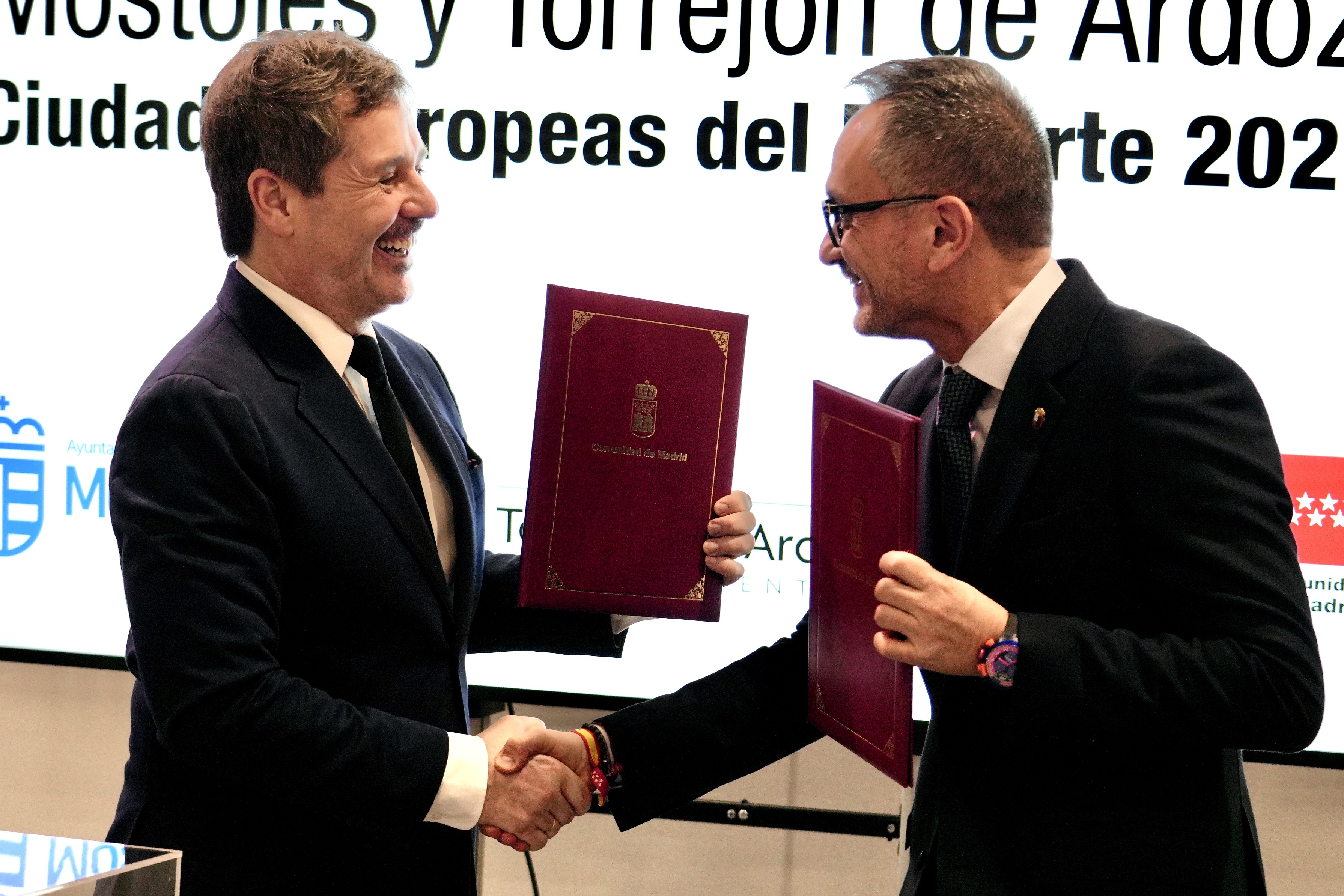 destacada Protocolo de colaboración con motivo de la Ciudad Europea del Deporte 2026 (1)destacada Protocolo de colaboración con motivo de la Ciudad Europea del Deporte 2026 (1)El alcalde de Móstoles, Manuel Bautista, y el consejero de Cultura, Turismo y Deporte, Mariano de Paco, han firmado un protocolo general de colaboración entre el Ayuntamiento y la Comunidad de Madrid para impulsar la celebración de actividades y eventos deportivos en el municipio con motivo de su designación como Ciudad Europea del Deporte 2026.