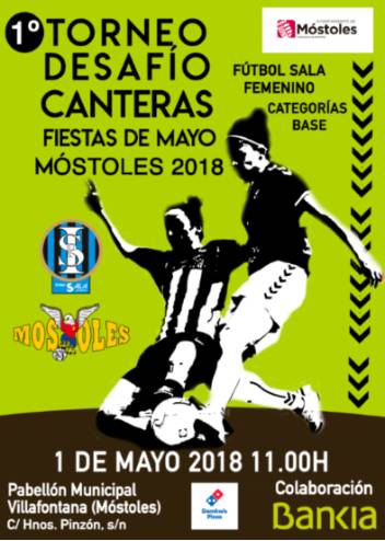 Imagen en alta resolución. Este enlace se abrirá mediante lightbox, puede haber un cambio de contextoMóstoles organizará, el día 1 de mayo, la primera edición del Torneo Desafío Canteras Fiesta de Mayo 2018 de fútbol sala femenino, categoría base. El evento se compondrá de diferentes encuentros entre las canteras de Intersala Zaragoza y FSF Móstoles. El orden de los encuentros del torneo es el siguiente: de 11 a 12h. Infantiles, de 12 a 13h Cadetes y de 13 a 14h Promesas-Intersala Segunda división.