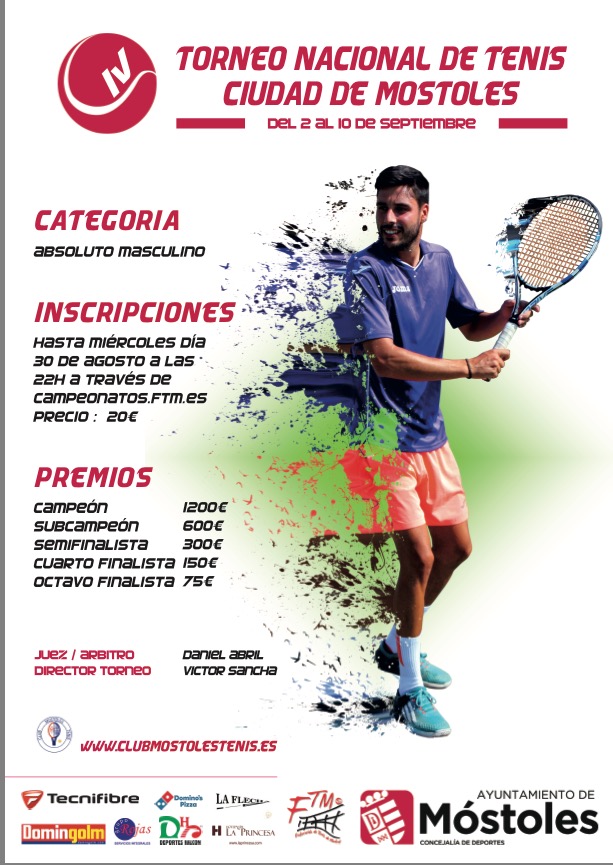 En el marco de las fiestas de septiembre se celebrará el IV Torneo Nacional de Tenis Ciudad de Móstoles, categoría absoluto masculino. Los interesados en participar en la competición, que se celebrará del 2 al 10 de septiembre, podrán inscribirse hasta el miércoles 30 de agosto, en la web campeonatos.ftm.es.