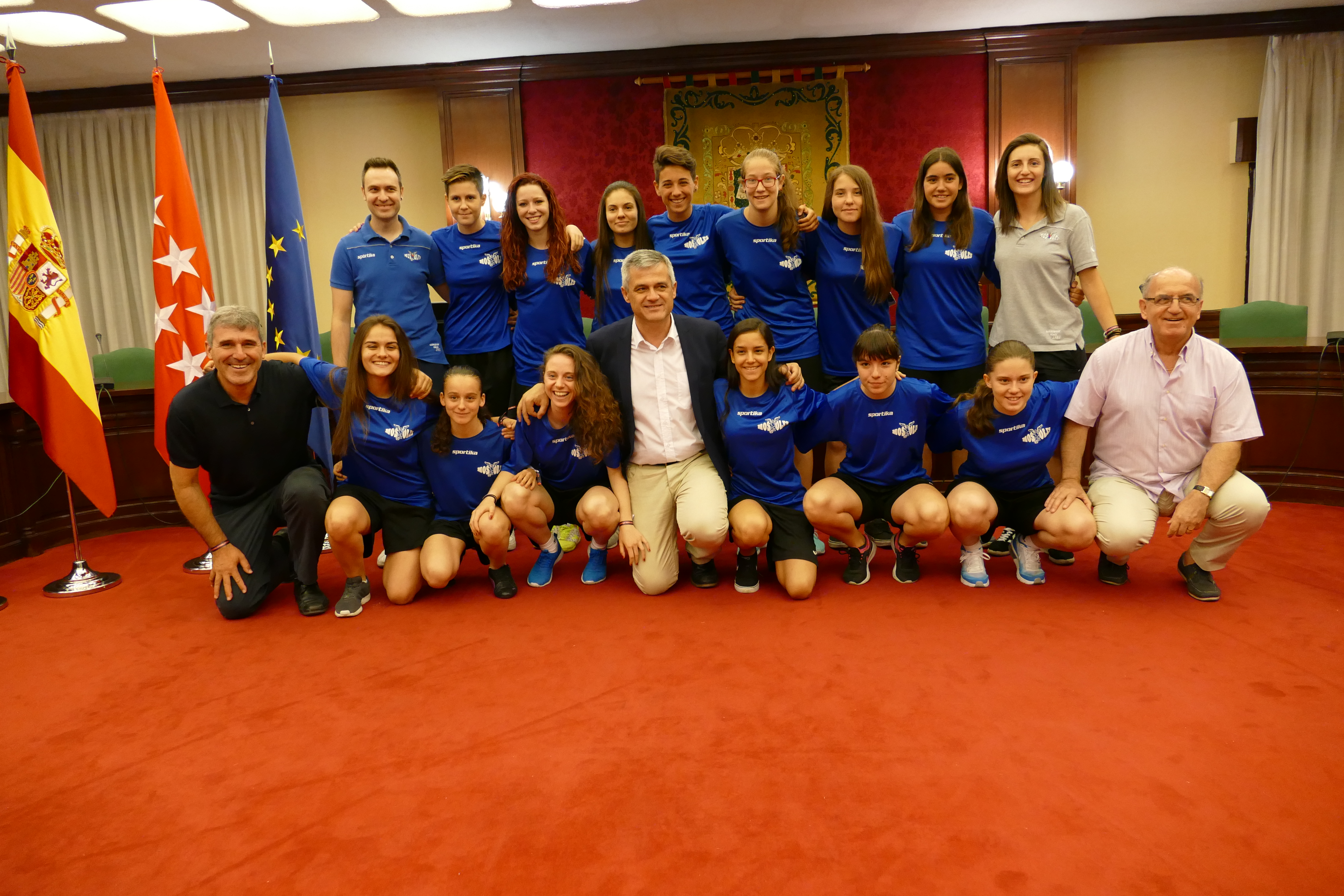 El alcalde de Móstoles, David Lucas, y el concejal de Deportes, Agustín Martín, han recibido esta mañana, en el salón de plenos del Ayuntamiento de Móstoles, a representantes de los ocho equipos de fútbol sala que participan en el Torneo Nacional de esta disciplina, organizado por el club de Fútbol Sala Femenino de la localidad (FSF), la Real Federación de Fútbol y la Federación Madrileña de Fútbol Sala.