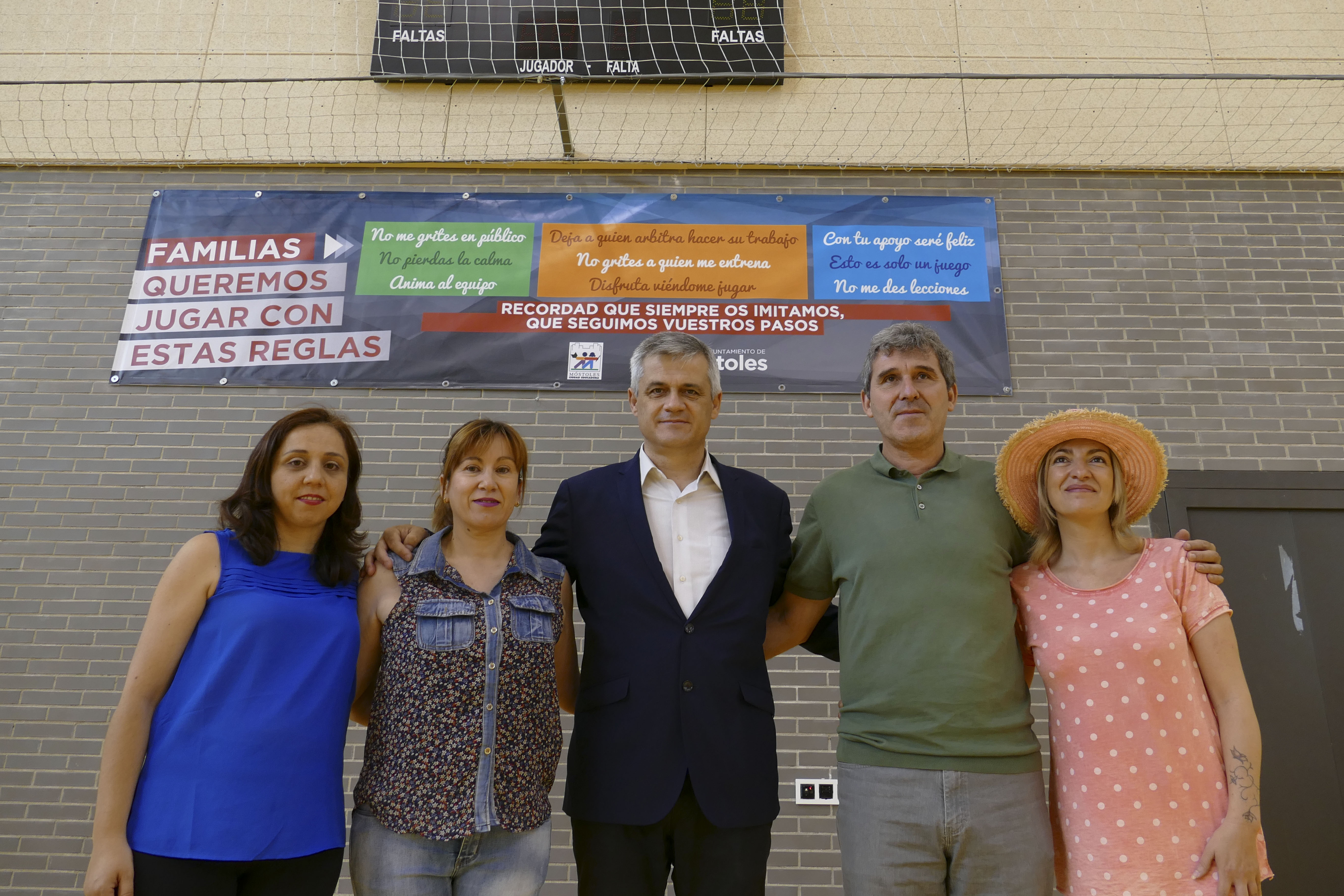 Después de comprobar que hay algunas personas que acompañan a los niños y niñas a los partidos, competiciones y entrenamientos, a las que les cuesta controlar sus emociones, dan directrices y se involucran en el deporte de los más pequeños como si ellos fueran los que dirigen, la Concejalía de Deportes y la de Educación ha tomado la iniciativa conjunta de colocar unas pancartas informativas en nueve instalaciones deportivas municipales. La primera pancarta se ha instalado en el pabellón municipal del PAU-4 esta mañana, en un acto que ha contado con el alcalde, David Lucas, el concejal de Deportes, Agustín Martín, la concejala de Educación, Isabel Cruceta y representantes de la Asociación de Vecinos Constelaciones.