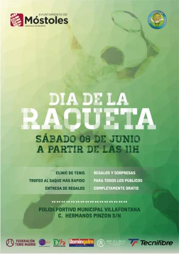 Día de la Raqueta 2019Imagen en alta resolución. Este enlace se abrirá mediante lightbox, puede haber un cambio de contextoDía de la Raqueta 2019El Polideportivo Municipal de Villafontana será sede, este sábado 8 de junio a las 11:00 horas, del Día de la Raqueta 2019, organizada por el Club Mostoles Tenis con la colaboración de la Concejalía de Deportes de Móstoles y la Federacion de Tenis de Madrid.