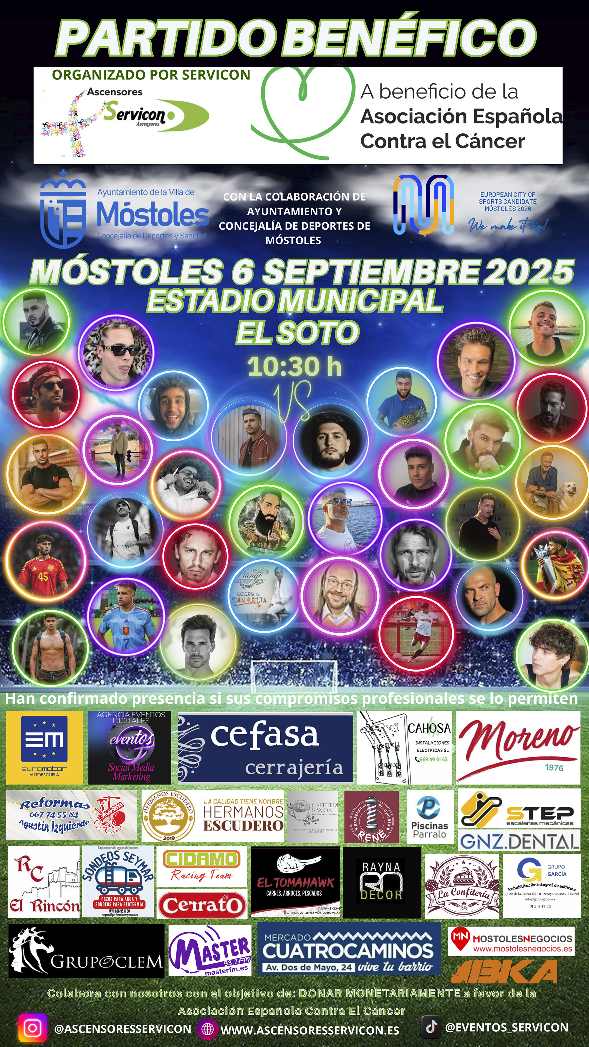 El encuentro, que se disputará a las 10:30 h en el estadio municipal El Soto, reunirá a músicos, actores, deportistas y celebridades como Santiago Segura, Pedro García Aguado, Pitingo, Omar Montes, Luis Mottola, Lucas Bergamini, Alejandro Parralo, Claudia Martínez, Adri Contreras, Naim Thomas, Iban García, Eduardo Rosa y Adrián Cruz, entre otros muchos.