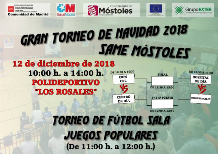 Imagen en alta resolución. Este enlace se abrirá mediante lightbox, puede haber un cambio de contextoEl Pabellón Municipal de los Rosales acogerá, el próximo 12 de diciembre, el Torneo de Navidad 2018 SAME de Móstoles. En el evento, que cuenta con la colaboración de la Concejalía de Deportes, participarán el Hospital de Día de Móstoles y el Centro de Día Móstoles, pertenecientes a la Consejería de Sanidad y los Recursos de Rehabilitación, adscritos a la Consejería de Políticas Sociales y Familia.