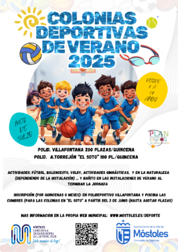 El Ayuntamiento de Móstoles, a través de la Concejalía de Deportes y Sanidad, ofrece 600 plazas en las colonias deportivas de verano, dirigidas a niños de entre 6 y 14 años. Estas actividades, que se desarrollarán durante el mes de julio, ofrecen una alternativa de ocio para el periodo no lectivo escolar.