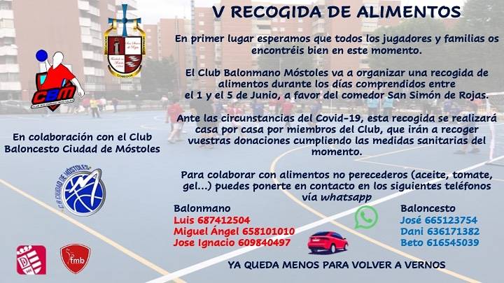 El Club Balonmano Móstoles, en colaboración con el Club Baloncesto Cuidad de Móstoles, organiza durante la semana del 1 al 5 de junio una campaña solidaria dirigida a apoyar a las familias que lo están pasando mal y al Comedor San Simón de Rojas.