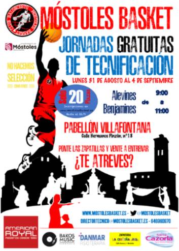 Cartel jornadas tecnificacionImagen en alta resolución. Este enlace se abrirá mediante lightbox, puede haber un cambio de contextoCartel jornadas tecnificacionEl Club de Baloncesto Móstoles Basket y la Concejalía de Deportes, uno de cuyos objetivos es fomentar el deporte de base, invitan a los niños y niñas del municipio que quieran iniciarse en la práctica de este deporte a participar en las Jornadas de Puertas Abiertas y Tecnificación, que se celebrarán del 31 de agosto al 4 de septiembre en el pabellón municipal de Villafontana.