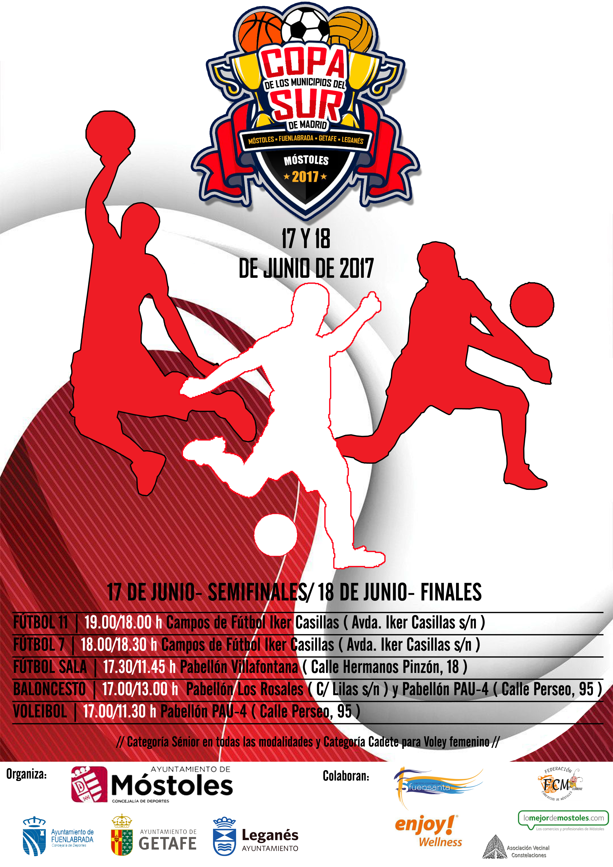 Imagen en alta resolución. Este enlace se abrirá mediante lightbox, puede haber un cambio de contextoMóstoles acogerá los días 17 y 18 de junio la Copa de los Municipios del Sur de Madrid, una competición en la que los campeones de las ligas de fútbol-7, fútbol-11, baloncesto, fútbol-sala y voleibol de los diferentes municipios participantes (Móstoles, Getafe, Leganés y Fuenlabrada) se disputarán este torneo a través de un sistema de semifinal y final: Getafe contra Fuenlabrada y Móstoles contra Leganés. El evento estará organizado por el Ayuntamiento de Móstoles, en colaboración con los de Getafe, Leganés y Fuenlabrada, municipio que acogió la edición de 2016. Las competiciones serán en categoría sénior en todas las modalidades, además de cadete femenino en voleibol.