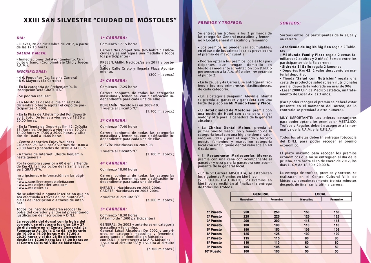 Cartel San Silvestre 2017Imagen en alta resolución. Este enlace se abrirá mediante lightbox, puede haber un cambio de contextoCartel San Silvestre 2017Cerca de 3.000 corredores en las categorías prebenjamín, benjamín, alevín, infantil, cadete y general local absoluta, se darán cita este jueves 28 de diciembre en la XXIII San Silvestre "Ciudad de Móstoles" organizada por la Concejalía de Deportes, junto la Asociacion Atlética de Móstoles.