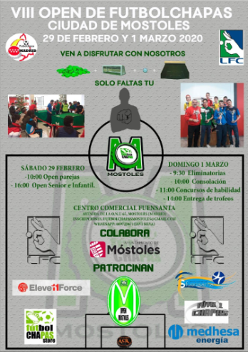 Imagen en alta resolución. Este enlace se abrirá mediante lightbox, puede haber un cambio de contextoEste fin de semana Móstoles acoge la VIII edición del Open de Futbolchapas del circuito (LFC Tour 2019/2020). El evento contará con la participación de los jugadores más laureados del panorama nacional. Madrid, Valladolid, Zaragoza, la Solana, Azuqueca, Móstoles, Getafe, Tomares, Cáceres, Mérida, etc.