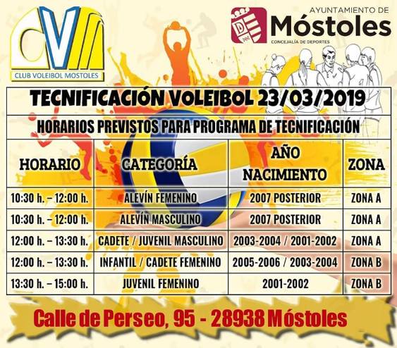 Imagen en alta resolución. Este enlace se abrirá mediante lightbox, puede haber un cambio de contextoEste sábado 23 de marzo de 10:30 a 15:00h en el Pabellón Municipal Móstoles Sur (Calle Perseo, 95) en las categorías: alevín masculino y femenino, cadete masculino y femenino, infantil femenino, juvenil masculino y femenino, el Club Voleibol Móstoles realiza una jornada de tecnificación para todas las categorías. Ven a disfrutar de un buen rato de Voleibol.