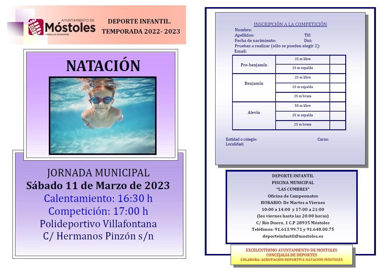 Todos aquellos deportistas que quieran participar pueden inscribirse en la oficina de campeonatos de la piscina Las Cumbres, de martes a viernes, de 10:00 h a 14:00 h y 17:00 h a 21:00 h, en la calle Río Duero,1 o enviando un correo a deporteinfantil@mostoles.esEste enlace se abrirá en una ventana nueva