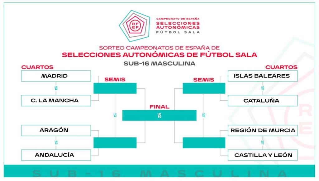 En la categoría Sub-16, disputarán los cuartos de final: la Selección de Madrid contra la Selección de Castilla-La Mancha; la Selección Aragonesa contra la Selección Andaluza; la Selección de las Islas Baleares contra la Selección de Cataluña, y la Selección de la Región de Murcia contra la Selección de Castilla y León.