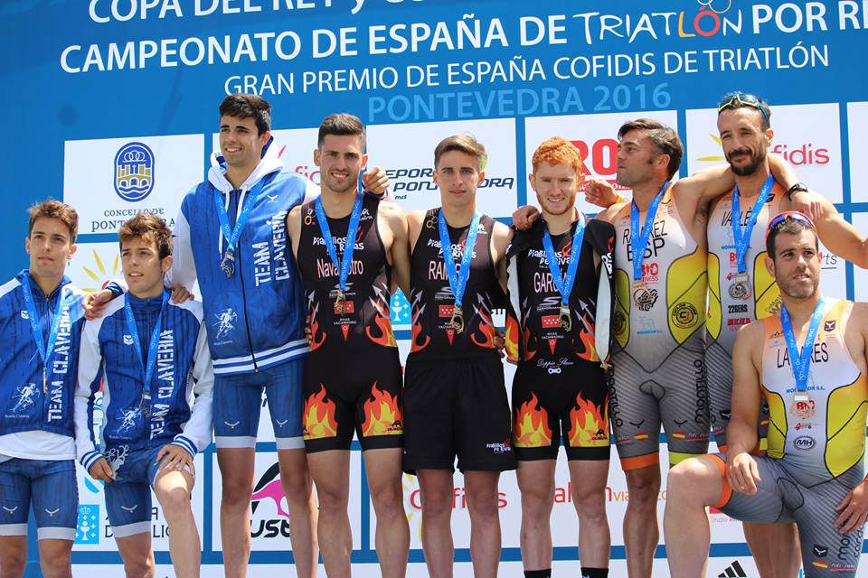 Imagen en alta resolución. Este enlace se abrirá mediante lightbox, puede haber un cambio de contextoLa Copa del Rey de Triatlón y el Campeonato de España de equipos de relevos se disputaron en Pontevedra. Allí se dieron cita varios equipos de Triatlón Clavería Móstoles, en categorías elite, open y cadetes, con un total de 28 participantes, repartidos en 6 equipos. El mejor resultado lo consiguió la categoría open masculina con un el tercer puesto, así como el quinto puesto del equipo femenino.