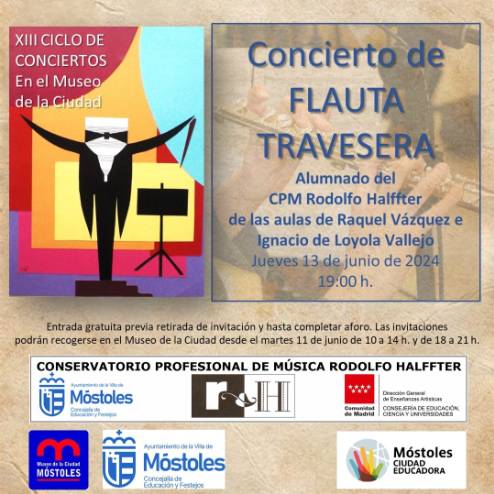 A partir del jueves 13, se ofrecerá un concierto de "Flauta travesera", a cargo del alumnado del Conservatorio Profesional de Música Rodolfo Halffter, de las aulas de Raquel Vázquez e Ignacio de Loyola Vallejo, dentro del XIII Ciclo de Conciertos en el Museo de la Ciudad, a las 19:00 h. La entrada es gratuita, previa retirada de invitaciones en el propio centro a partir del martes 11 de junio.
