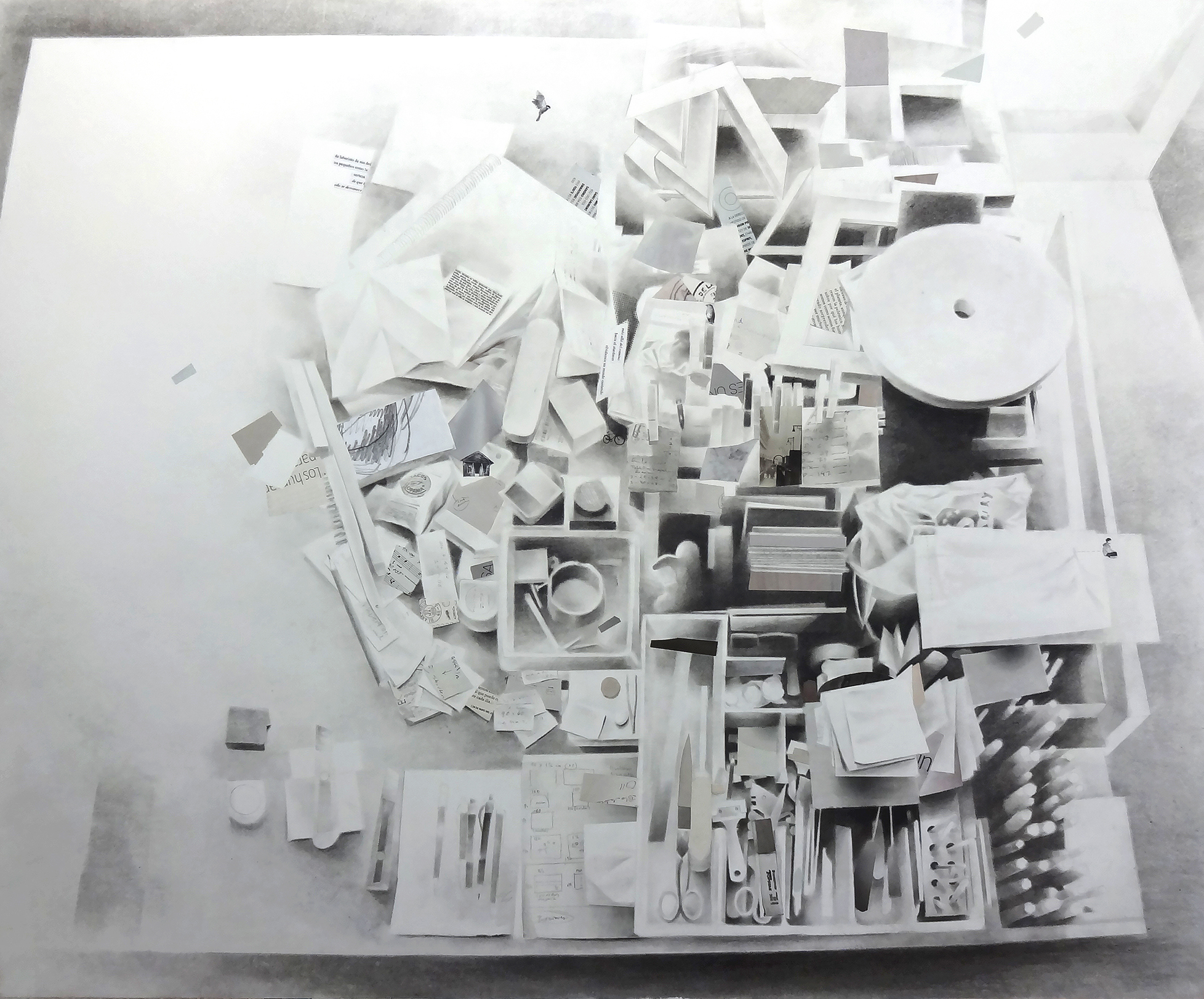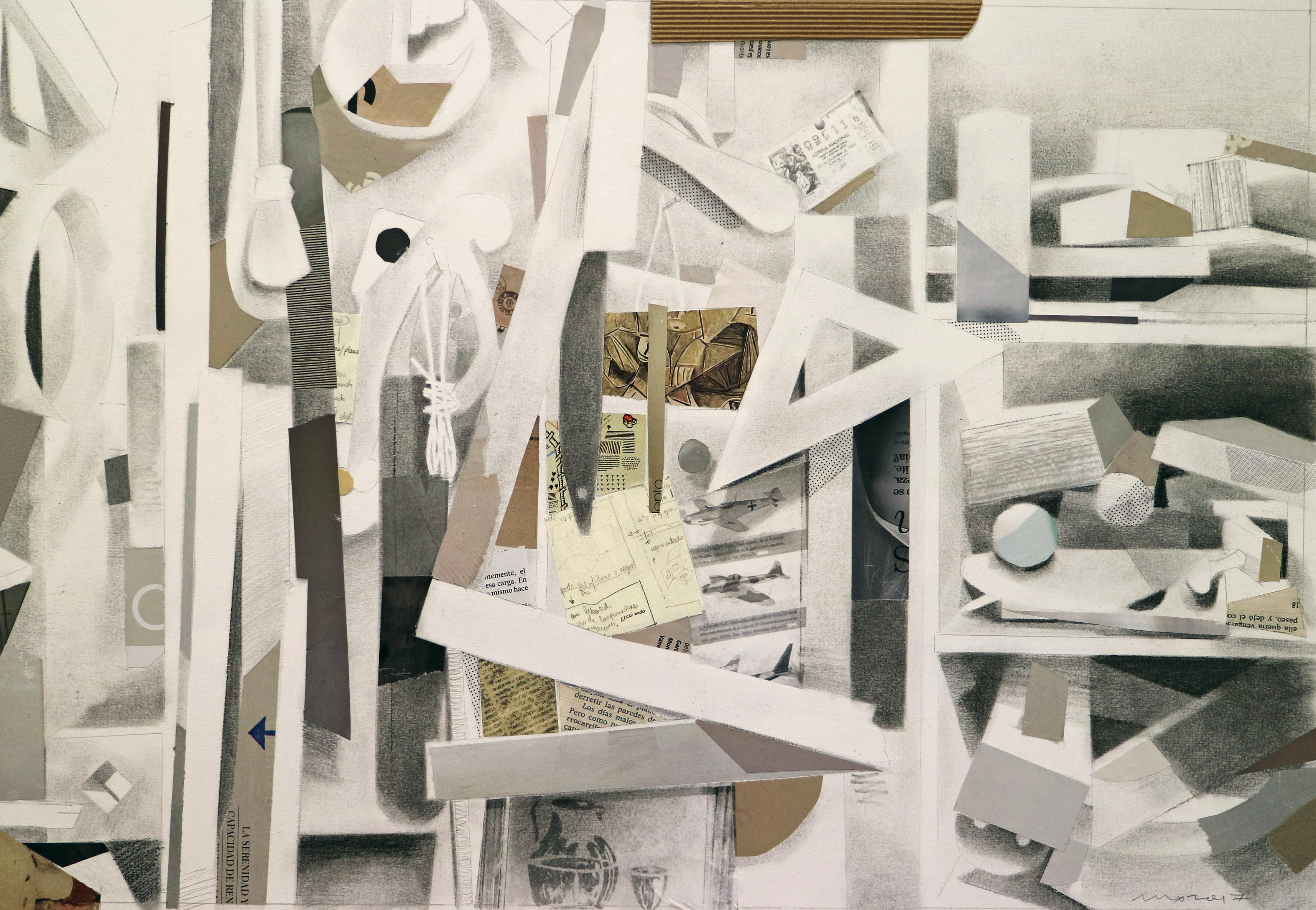 En una primera instancia observamos un motivo relacionado con el mundo de la artesanía (talleres, carpinterías...) realizado al carbón y collage sobre papel adherido a bastidor con chapa.