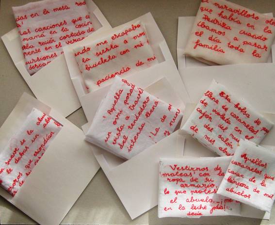 Hilvanar Recuerdos: En el caso del hilo quiero mostrar la permanencia de este en el tejido, simbolizando los recuerdos de la memoria familiar. El tiempo de recordar, el tiempo de escribir, el tiempo de bordar y el tiempo de observar y compartir con los demás esos recuerdos.