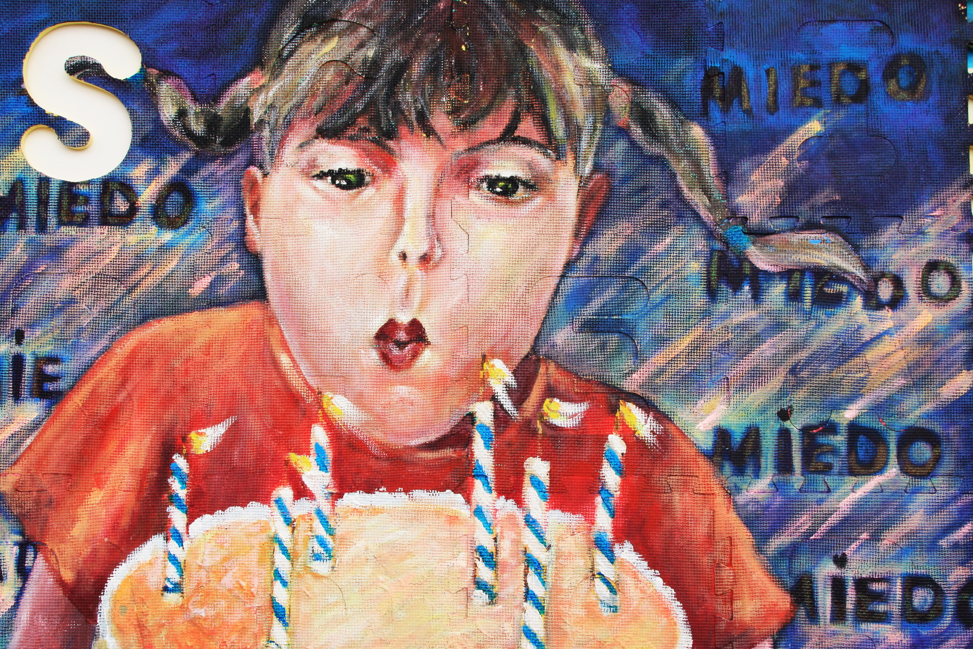 ECUCHANDO EL SILENCIO, está formada por siete retratos de 122 x 92 cm. Retratos realizados sobre alfombras puzle de goma-eva. Un material utilizado para el gateo y los primeros pasos de los niños, un soporte idóneo para representar el autismo: Por su fragilidad y por estar formado por distintas piezas iguales a simple vista pero esencialmente muy diferentes, y aunque a algunas nos cueste encontrarles su lugar, al final todas encajan.