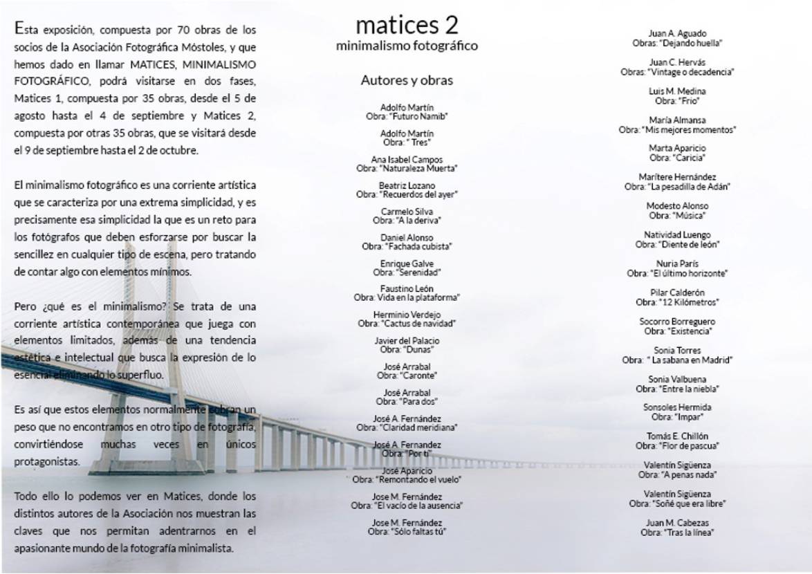Esta exposición, compuesta por 70 obras de los socios de la Asociación Fotográfica Móstoles, y que han dado en llamar MATICES, MINIMALISMO FOTOGRÁFICO, podrá visitarse en dos fases: Matices 1, compuesta por 35 obras, desde el 5 de agosto hasta el 4 de septiembre y Matices 2, compuesta por otras 35 obras, que se visitará desde el 9 de septiembre hasta el 2 de octubre.El minimalismo fotográfico es una corriente artística que se caracteriza por una extrema simplicidad, y es precisamente esa simplicidad la que es un reto para los fotógrafos que deben esforzarse por buscar la sencillez en cualquier tipo de escena, pero tratando de contar algo con elementos mínimos.