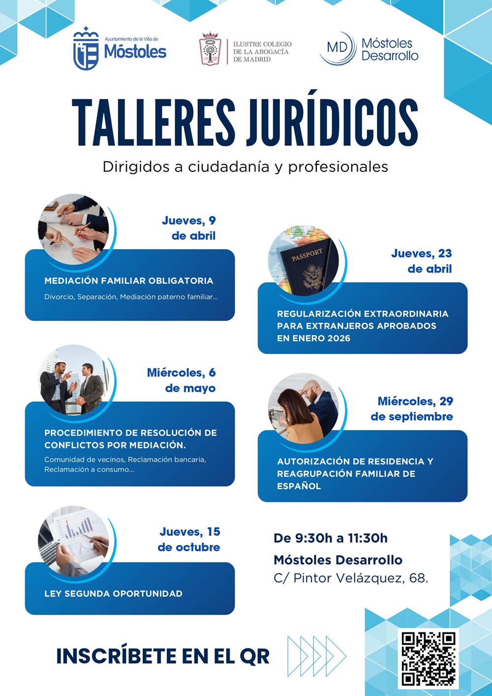 El Ayuntamiento de Móstoles, a través de Móstoles Desarrollo y en colaboración con el Ilustre Colegio de Abogacía de Madrid (ICAM), ofrece un ciclo de talleres jurídicos gratuitos dirigidos a la ciudadanía, profesionales y empresas.