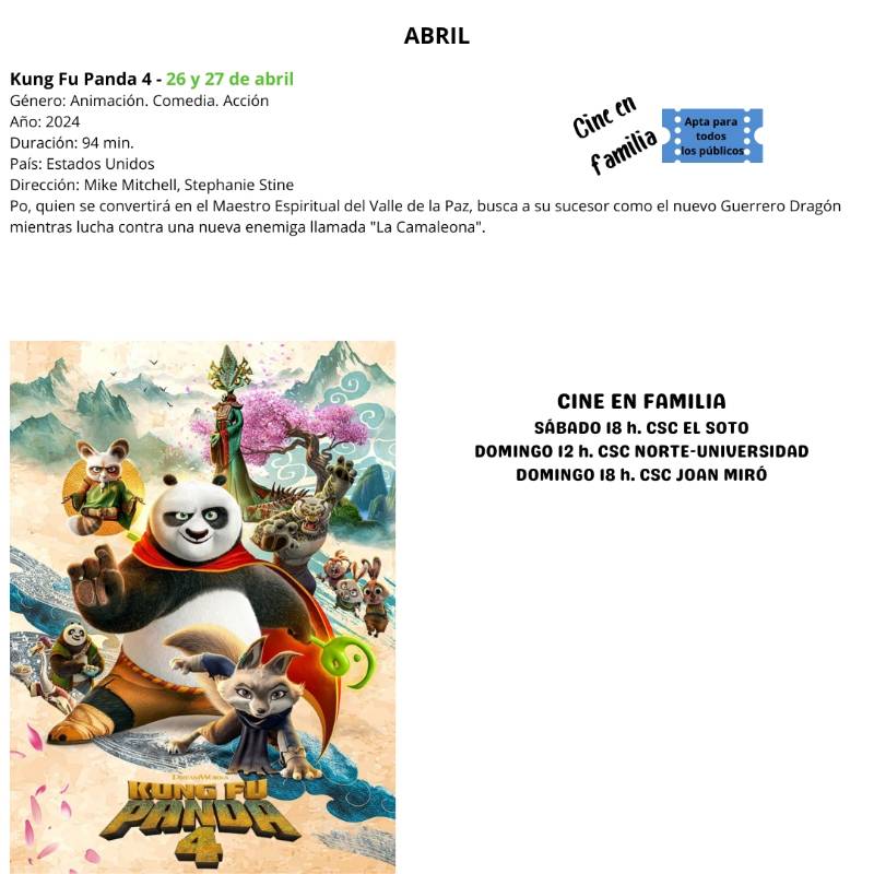 "Kung Fu Panda 4", proyección gratuita dentro de Cine en familia, en el Centro Sociocultural Norte-Universidad a las 12:00 horas, y en el Centro Sociocultural Joan Miró a las 18:00 horas. Para todos los públicos. Retirada de invitaciones desde el lunes en el propio centro, de 10 a 14 y de 17 a 20 horas.