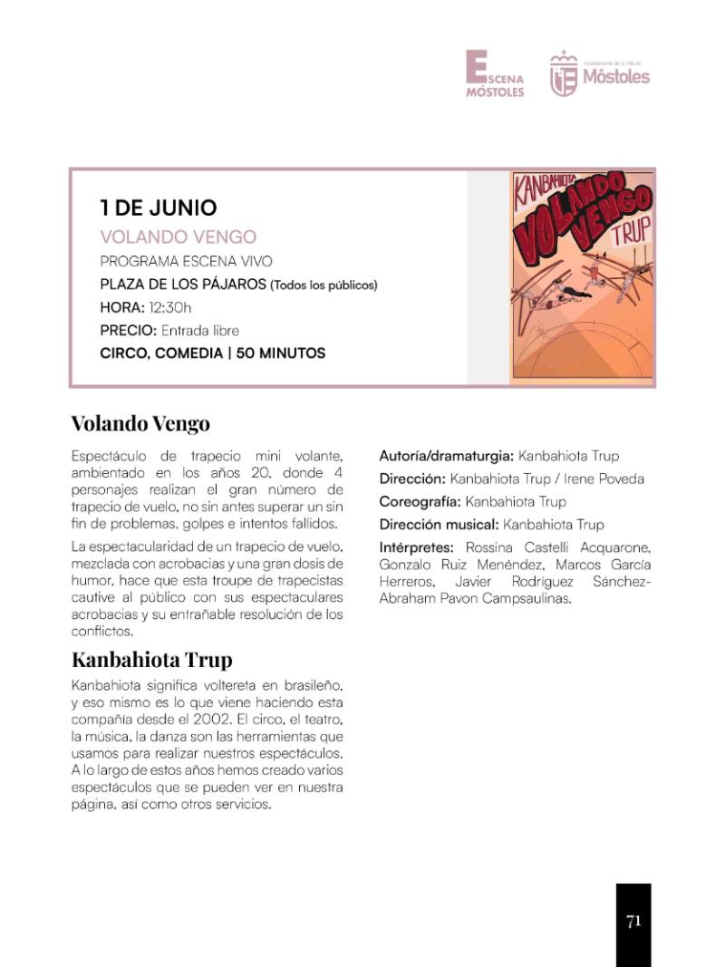 "Volando vengo", circo al aire libre de la compañía Kanbahiota Trup, en la Plaza de los Pájaros a las 12:30 horas. Entrada libre. 50 minutos. Todos los públicos.
