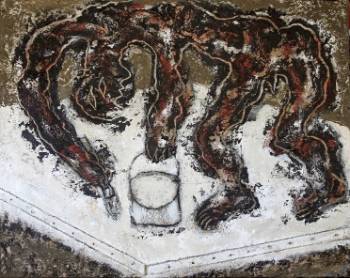 Así, con estas premisas, nos encontramos con personajes que han sustituido la cabeza por una rueda, dejando que ésta les lleve erráticamente - y al revés- por la vida. Grupos que transportan enseres hacia algún lugar incierto, que cargan con jarras funerarias o escaleras con las que, tal vez, pretenden alcanzar el cielo. Besos que funden rostros o cuerpos que se encajan en abrazos imposibles. Un animal relleno de cabezas. Abanicos rotos. Gente trabajando o haciendo el amor. Un acordeonista... y un largo etcétera que conforma su pequeño gran universo repleto de sorpresas y contrastes.