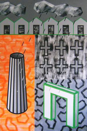 El hilo conductor de esta artista americana afincada en Segovia desde los años 80 es el paisaje post urbano. Jennifer hace alusión a las zonas limítrofes de las ciudades, partiendo de una figuración sintetizada a una mayor abstracción en la obra más reciente. Dentro del colorido vibrante se divisan una serie de elementos arquitectónicos geométricos como el muro, la torre de alta tensión, la casa, la cruz, la chimenea, el féretro…motivos que tienen un significado simbólico como la muerte, el hogar, etc.
