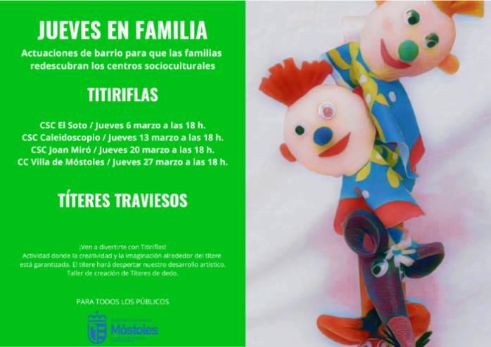 La compañía Titiriflas estará con "Títeres traviesos" el jueves 6 en el Centro Sociocultural El Soto, el jueves 13 en el Centro Sociocultural Caleidoscopio, el jueves 20 en el Centro Sociocultural Joan Miró y el jueves 27 en el Centro Cultural Villa de Móstoles. Todas las sesiones comenzarán a las 18:00 h. La entrada es libre hasta completar aforo.